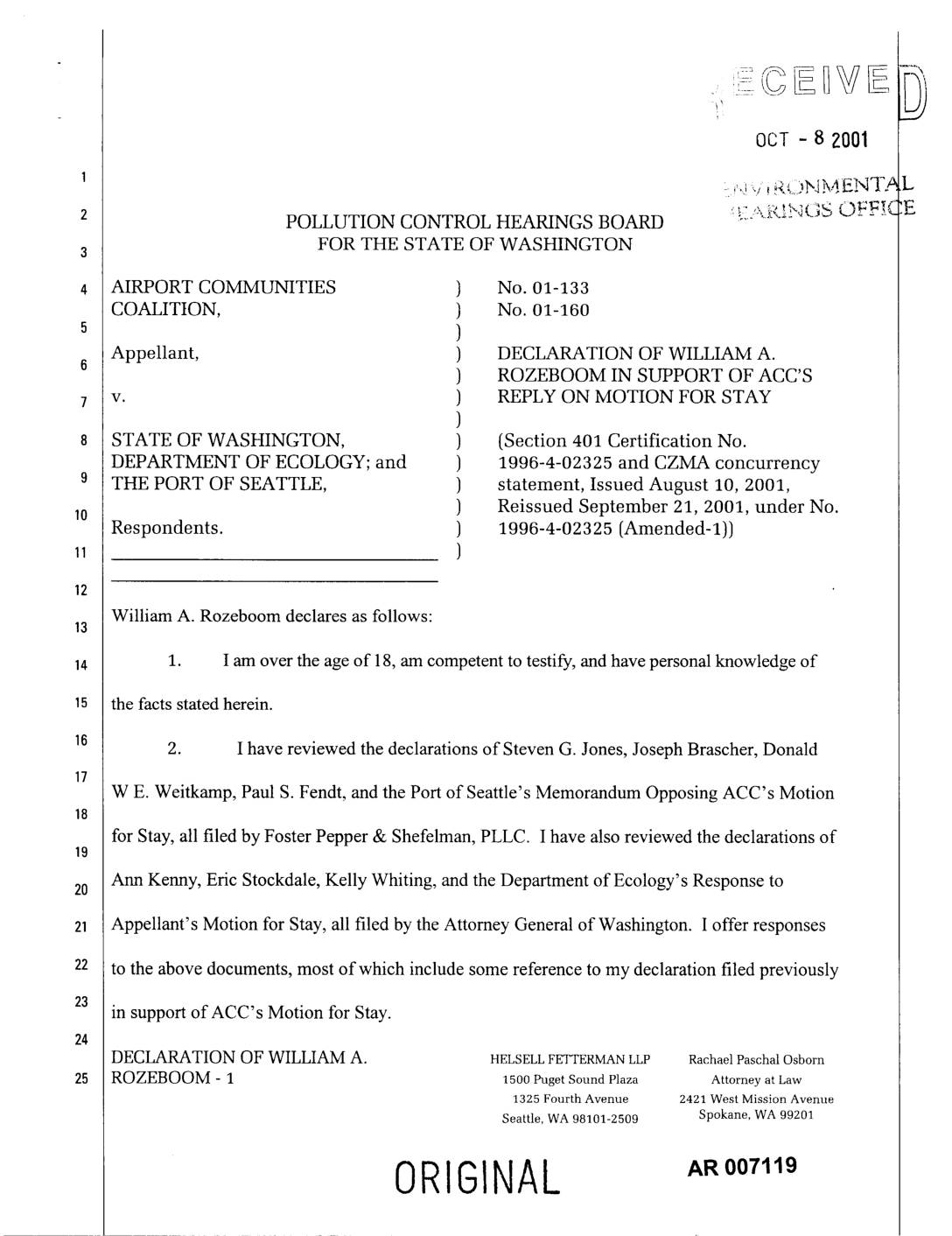 v. ) REPLY ON MOTION FOR STAY ) STATE OF WASHINGTON, ) (Section 401 Certification No. DEPARTMENT OF ECOLOGY; and ) 1996-4-02325 and CZMA concurrency THE PORT OF SEATTLE, ) statement, Issued August 10, 2001, ) Reissued September 21, 2001, under No. Respondents. ) 1996-4-02325 (Amended-I)) ) William A. Rozeboom declares as follows: 1. I am over the age of 18, am competent to testify, and have personal knowledge of the facts stated herein. 2. I have reviewed the declarations of Steven G. Jones, Joseph Brascher, Donald W E. Weitkamp, Paul S. Fendt, and the Port of Seattle's Memorandum Opposing ACC's Motion for Stay, all filed by Foster Pepper & Shefelman, PLLC. I have also reviewed the declarations of Ann Kenny, Eric Stockdale, Kelly Whiting, and the Department of Ecology's Response to20 -