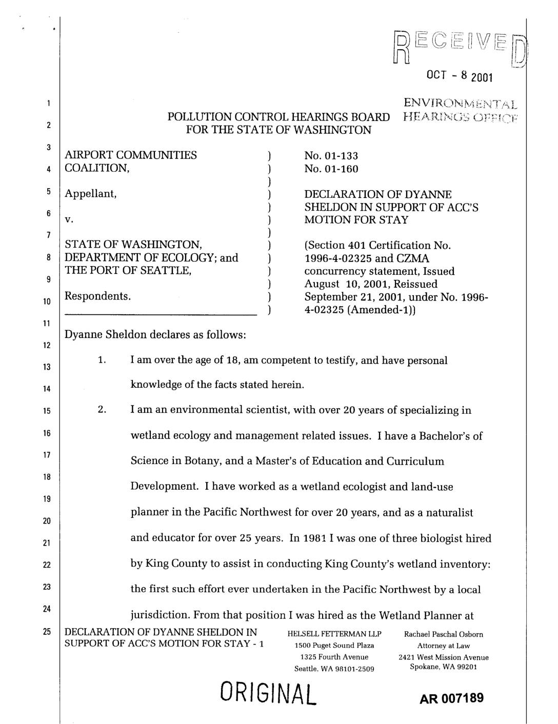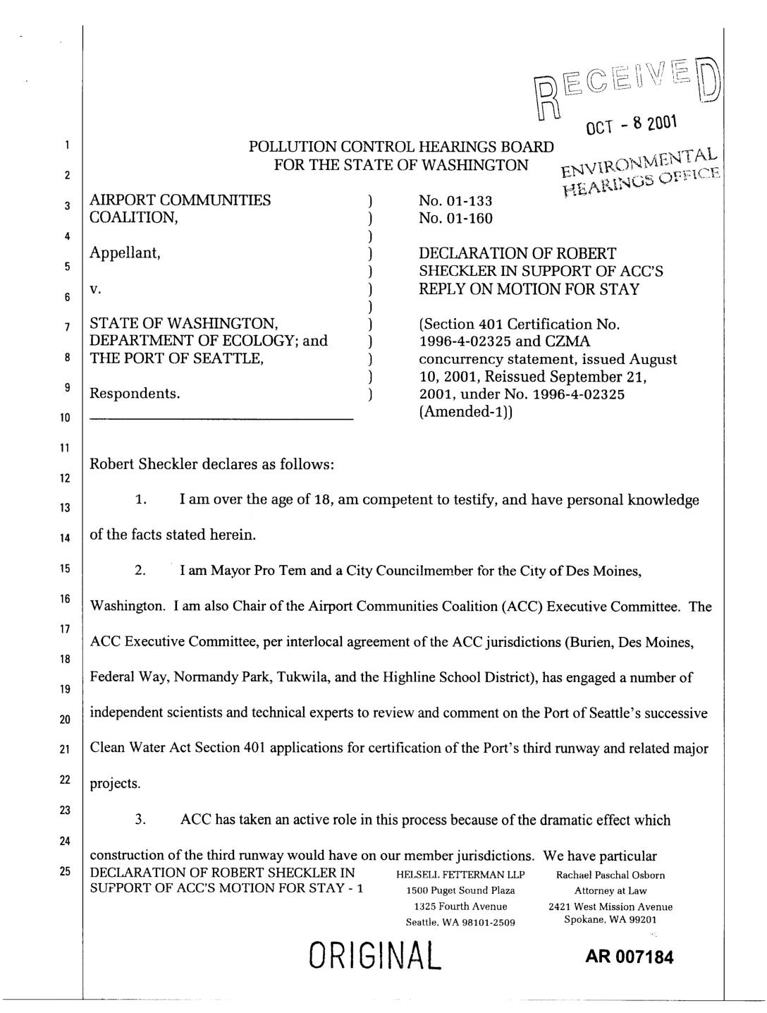 v. ) REPLY ON MOTION FOR STAY ) STATE OF WASHINGTON, ) (Section 401 Certification No. DEPARTMENT OF ECOLOGY; and } 1996-4-02325 and CZMA THE PORT OF SEATTLE, ) concurrency statement, issued August ) 10, 2001, Reissued September 21, Respondents. ) 2001, under No. 1996-4-02325 (Amended-I)) Robert Sheckler declares as follows: 1. I am over the age of 18, am competent to testify, and have personal knowledge13 of the facts stated herein. 2. I am Mayor Pro Tem and a City Councilmember tbr the City of Des Moines, lS Washington. I am also Chair of the Airport Communities Coalition (ACC) Executive Committee. The ACC Executive Committee, per interlocal agreement of the ACC jurisdictions (Burien, Des Moines, Federal Way, Normandy Park, Tukwila, and the Highline School District), has engaged a number of19 independent scientists and technical experts to review and comment on the Port of Seattle's successive Clean Water Act Section 401 applications for certification of the Port's third runway and related major projects. 3. ACC has taken an active role in this process because of the dramatic effect which construction of the third runway would have on our member jurisdictions. We have particular DECLARATION OF ROBERT SHECKLERIN HELSELLFETTERMANLLP RachaelPaschalOsborn SUPPORT OF ACC'S MOTION FOR STAY - 1 15ooPugetSoundPlaza Attorneyat Law 1325 Fourth Avenue 2421 West Mission Avenue Seattle, WA 98101-2509 Spokane, WA 99201 ORIGINAL .oor 8, stewardship responsibilities under state law and our own municipal codes for the streams and watersheds within our boundaries, including Des Moines Creek, Miller Creek,… -