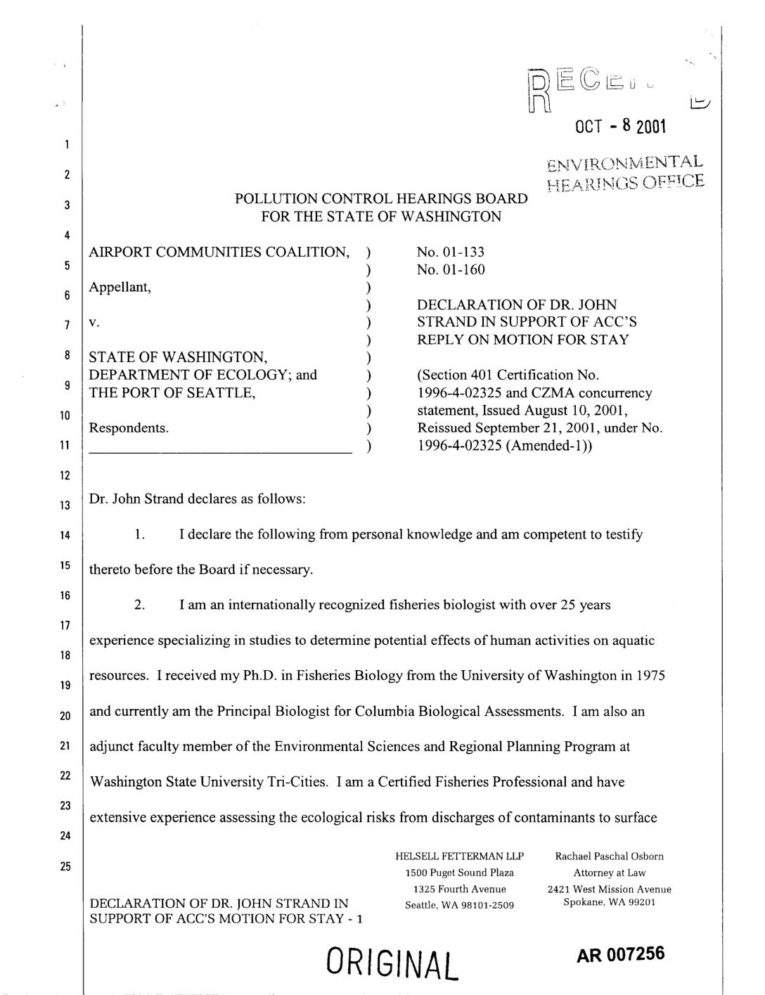 v. ) STRAND IN SUPPORT OF ACC'S ) REPLY ON MOTION FOR STAY STATE OF WASHINGTON, ) DEPARTMENT OF ECOLOGY; and ) (Section 401 Certification No.9 THE PORT OF SEATTLE, ) 1996-4-02325 and CZMA concurrency ) statement, Issued August 10, 2001, Respondents. ) Reissued September 21, 2001, under No. ) 1996-4-02325 (Amended-l)) Dr. John Strand declares as follows:13 1. I declare the following from personal knowledge and am competent to testify thereto before the Board if necessary. 2. I am an internationally recognized fisheries biologist with over 25 years experience specializing in studies to determine potential effects of human activities on aquatic resources. I received my Ph.D. in Fisheries Biology from the University of Washington in 197519 and currently am the Principal Biologist for Columbia Biological Assessments. I am also an adjunct faculty member of the Environmental Sciences and Regional Planning Program at Washington State University Tri-Cities. I am a Certified Fisheries Professional and have extensive experience assessing the ecological risks from discharges of contaminants to surface HELSELL FETTERMAN LLP Rachael Paschal Osborn 1500 Puget Sound Plaza Attorney at Law 1325 Fourth Avenue 2421 West Mission Avenue DECLARATION OF DR. JOHN STRAND IN Seattle, WA 98101-2509 Spokane,WA99201 SUPPORT OF ACC'S MOTION FOR STAY - 1 ORIGINAL waters on sensitive aquatic species and their habitats. I also have substantive local knowledge, having studied the fate of stormwater residuals in both Miller and Des Moines Creeks for the a Airport Communities Coalition (ACC), an organization composed of the Cities of Burien, Des… -