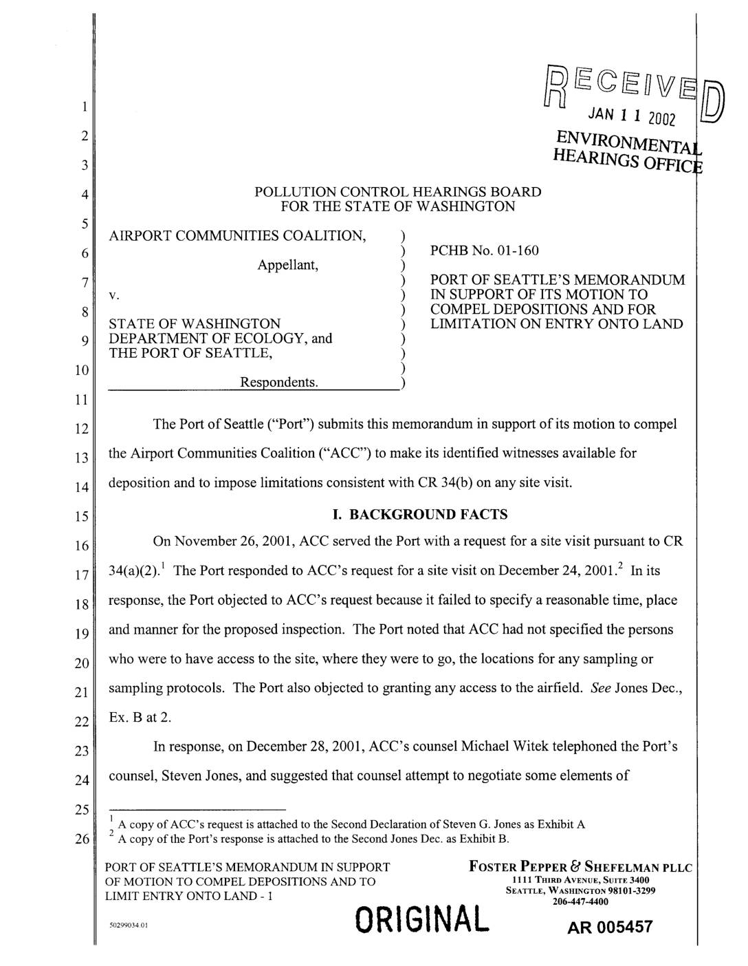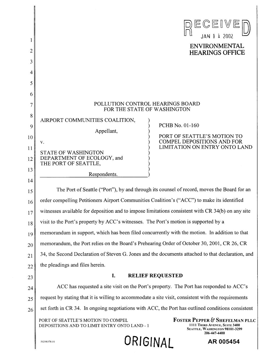 The Port of Seattle ("Port"), by and through its counsel of record, moves the Board for an order compelling Petitioners Airport Communities Coalition's ("ACC") to make its identified witnesses available for deposition and to impose limitations consistent with CR 34(b) on any site visit to the Port's property by ACC's witnesses. The Port's motion is supported by a memorandum in support, which has been filed concurrently with the motion. In addition to that memorandum, the Port relies on the Board's Prehearing Order of October 30, 2001, CR 26, CR 34, the Second Declaration of Steven G. Jones and the documents attached to that declaration, and the pleadings and files herein. I. RELIEF REQUESTED ACC has requested a site visit on the Port's property. The Port has responded to ACC's request by stating that it is willing to accommodate a site visit, consistent with the requirements set forth in CR 34. In ongoing negotiations with ACC, the Port has outlined conditions consistent PORT OF SEATTLE'S MOTION TO COMPEL FOSTER PEPPER _d SHEFELMAN PLLC DEPOSITIONS AND TO LIMIT ENTRY ONTO LAND - 1 1111 TItlRDAVrNUr, SUITE3400 SEATTLE,WASmNGTON98101-3299 206-447-4400 ORIGINAL AR 005454 with that rule under which such a visit can take place. ACC has rejected the Port's conditions, and in a move designed to delay the discovery schedule in this matter and ultimately to force a delay in the hearing on the merits, ACC has refused to make any of its witnesses available for deposition until the site visit issue is resolved.… -