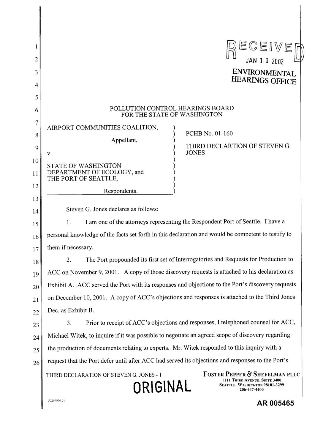 1. I am one of the attorneys representing the Respondent Port of Seattle. I have a personal knowledge of the facts set forth in this declaration and would be competent to testify to them if necessary. 2. The Port propounded its first set of Interrogatories and Requests for Production to ACC on November 9, 2001. A copy of those discovery requests is attached to his declaration as Exhibit A. ACC served the Port with its responses and objections to the Port's discovery requests on December 10, 2001. A copy of ACC's objections and responses is attached to the Third Jones Dec. as Exhibit B. 3. Prior to receipt of ACC's objections and responses, I telephoned counsel for ACC, Michael Witek, to inquire if it was possible to negotiate an agreed scope of discovery regarding the production of documents relating to experts. Mr. Witek responded to this inquiry with a request that the Port defer until after ACC had served its objections and responses to the Port's THIRDDECLARATIONOFSTEVENG.JONES- 1 FOSTERPEPPER _' SHEFELMANPLLC 1111 THIP,D AVENUE, SUITE 3400 0RIGINAL SEATTLE, W2;_H4147G440N098101-3299 5o_o_oOl AR 005465 discovery requests, as he believed that those responses might form a basis a stipulation regarding document production with respect to experts. 4. After ACC served its objections and responses to the Port's discovery requests on December 10, I scheduled a conference call with Mr. Witek in order for the parties to attempt to negotiate a mutually agreeable scope of discovery with respect to documents. That call took place… -