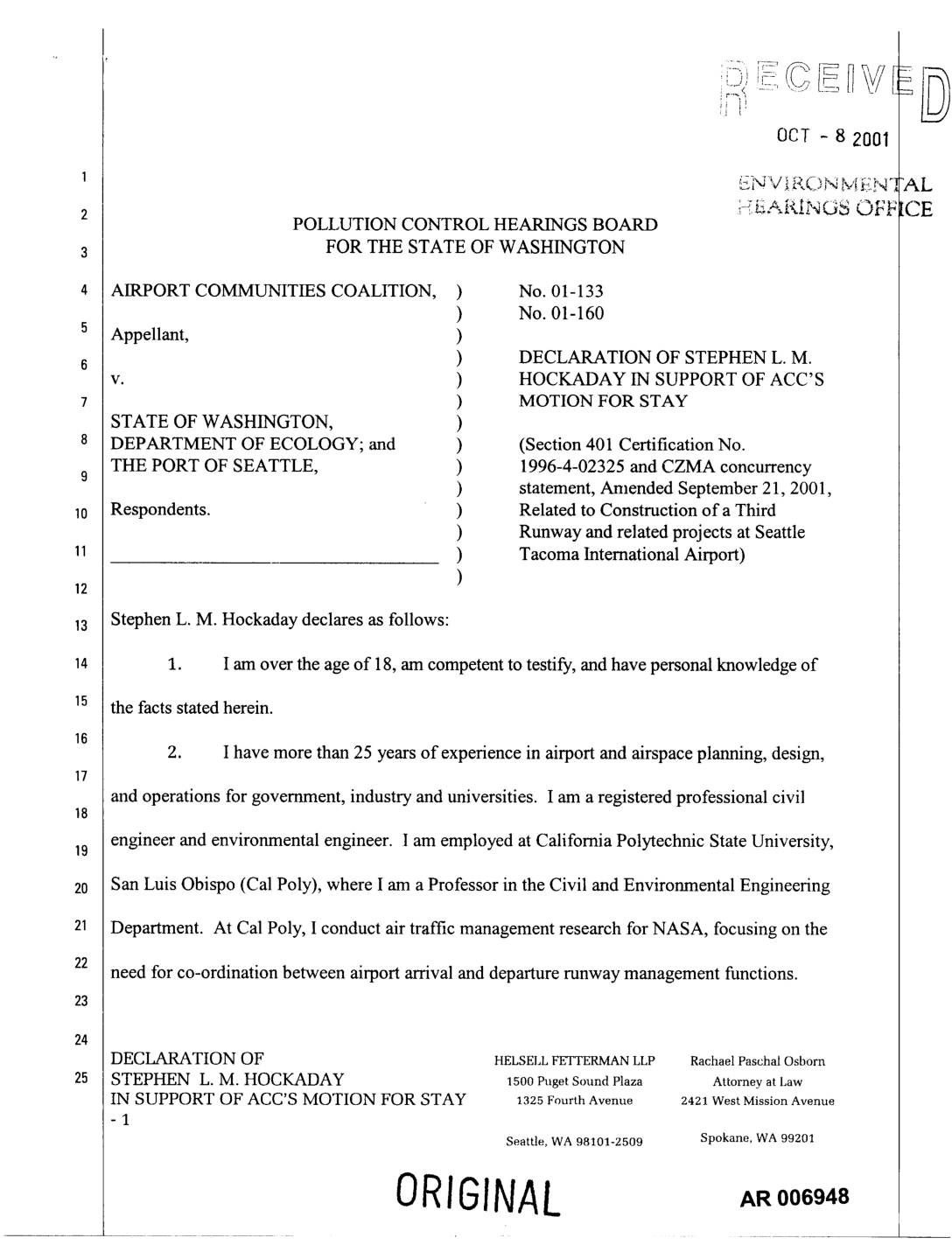 v. ) HOCKADAY IN SUPPORT OF ACC'S ) MOTION FOR STAY STATE OF WASHINGTON, ) DEPARTMENT OF ECOLOGY; and ) (Section 401 Certification No. THE PORT OF SEATTLE, ) 1996-4-02325 and CZMA concurrency ) statement, Amended September 21, 2001, Respondents. ) Related to Construction of a Third ) Runway and related projects at Seattle ) Tacoma International Airport) ) Stephen L. M. Hockaday declares as follows: 1. I am over the age of 18, am competent to testify, and have personal knowledge of the facts stated herein. 2. I have more than 25 years of experience in airport and airspace planning, design, and operations for government, industry and universities. I am a registered professional civil engineer and environmental engineer. I am employed at California Polytechnic State University, San Luis Obispo (Cal Poly), where I am a Professor in the Civil and Environmental Engineering Department. At Cal Poly, I conduct air traffic management research for NASA, focusing on the need for co-ordination between airport arrival and departure runway management functions. DECLARATION OF HELSELL FETTERMAN LLP Rachael Paschal Osborn STEPHEN L. M. HOCKADAY 1500PugetSound Plaza AttorneyatLaw IN SUPPORT OF ACC'S MOTION FOR STAY 1325 Fourth Avenue 2421 West Mission Avenue -1 Seattle, WA 98101-2509 Spokane, WA 99201 ORIGIN4L 3. For four years, I worked for the airspace and navigation division of Eurocontrol, an intemational organisation with 28 member countries that assists in the development and2 harmonisation of the airport and airspace infrastructure in Europe. I was Head of Eurocontrol's airspace and airport… -