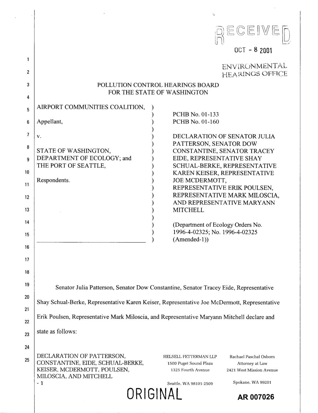 Senator Julia Patterson, Senator Dow Constantine, Senator Tracey Eide, Representative Shay Schual-Berke, Representative Karen Keiser, Representative Joe McDermott, Representative Erik Poulsen, Representative Mark Miloscia, and Representative Maryann Mitchell declare and state as follows:23 DECLARATION OF PATTERSON, HF.LSF.LLFETTERMAN LLP Rachael Paschal Osborn CONSTANTINE, EIDE, SCHUAL-BERKE, 1500 Puget Sound Plaza Attorney at Law KEISER, MCDERMOTT, POULSEN, 1325 Fourth Avenue 2421 West Mission Avenue MILOSCIA, AND MITCHELL - I Seattle, WA 98101-2509 Spokane, WA 99201 ORIGINAL 1. We are members of the Washington State Legislature. Among us, we have the following committee responsibilities in the Legislature: a a. Senator Julia Patterson, 33rd District: Chair, State and Local Government Committee; Environment, Energy & Water Committee; Labor, Commerce and Financial Institutions Committee; Transportation Committee.6 b. Senator Dow Constantine, 34th District: Vice Chair, Ways & Means Committee; Vice Chair, Judiciary Committee; Natural Resources, Parks & Shorelines Committee; Rules Committee. c. Senator Tracey Eide, 30th District: Vice Chair, Education Committee; Vice Chair, Environment, Energy & Water Committee; Transportation Committee; Rules Committee. d. Representative Shay Schual-Berke, 33rd District: Vice Chair, Healthcare Committee; Appropriations Committee; Education Committee. e. Representative Karen Keiser, 33rd District: Democratic Policy Chair; Appropriations Committee; Education Committee; Financial Institutions & Insurance Committee. f. Representative Joe McDermott, 34th District: Education Committee; Judiciary Committee; State Government Committee. g. Representative Erik Poulsen, 34th District: Co-Chair, Technology, Telecommunications & Energy Committee; Capital Budget Committee; Rules Committee. DECLARATION OF PATTERSON, HELSELL FETTERMAN LLP Rachael Paschal Osborn CONSTANTINE, EIDE, SCHUAL-BERKE, 150o Puget Sound Plaza Attorney at Law KEISER, MCDERMOTT, POULSEN, 1325 Fourth… -