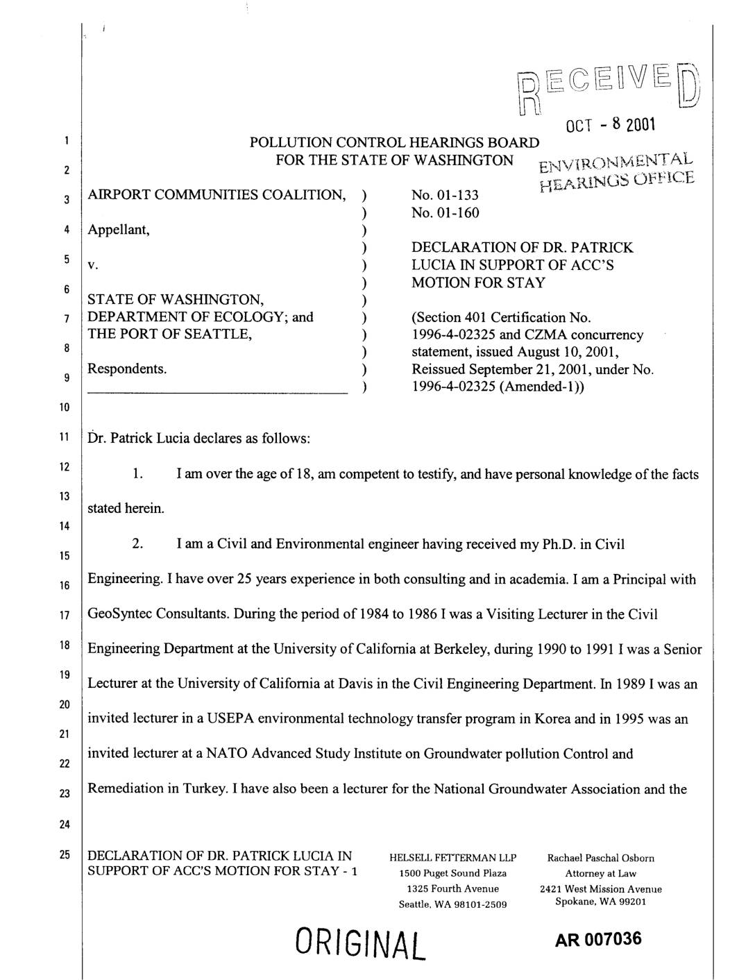 FOR THE STATE OF WASHINGTON E1,,I/fP, C)IqMENTAL AIRPORT COMMUNITIES COALITION, ) No. 01-133 ) No. 01-160 Appellant, ) ) DECLARATION OF DR. PATRICK v. ) LUCIA IN SUPPORT OF ACC'S ) MOTION FOR STAY STATE OF WASHINGTON, ) DEPARTMENT OF ECOLOGY; and ) (Section 401 Certification No. THE PORT OF SEATTLE, ) 1996-4-02325 and CZMA concurrency ) statement, issued August 10, 2001, Respondents. ) Reissued September 21, 2001, under No. ) 1996-4-02325 (Amended- 1)) Dr. Patrick Lucia declares as follows: 1. I am over the age of 18, am competent to testify, and have personal knowledge of the facts stated herein. 2. I am a Civil and Environmental engineer having received my Ph.D. in Civil Engineering. I have over 25 years experience in both consulting and in academia. I am a Principal with GeoSyntec Consultants. During the period of 1984 to 1986 1 was a Visiting Lecturer in the Civil Engineering Department at the University of California at Berkeley, during 1990 to 1991 I was a Senior Lecturer at the University of California at Davis in the Civil Engineering Department. In 1989 1 was an invited lecturer in a USEPA environmental technology transfer program in Korea and in 1995 was an invited lecturer at a NATO Advanced Study Institute on Groundwater pollution Control and22 Remediation in Turkey. I have also been a lecturer for the National Groundwater Association and the DECLARATION OF DR. PATRICK LUCIA IN HELSELL FETTERMAN LLP Rachael Paschal Osborn SUPPORT OF ACC'S MOTION FOR STAY - 1… -