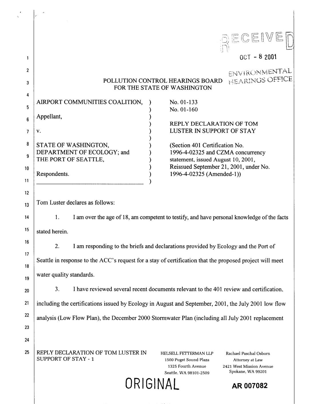 v. ) LUSTER IN SUPPORT OF STAY ) STATE OF WASHINGTON, ) (Section 401 Certification No. DEPARTMENT OF ECOLOGY; and ) 1996-4-02325 and CZMA concurrency9 THE PORT OF SEATTLE, ) statement, issued August 10, 2001, ) Reissued September 21, 2001, under No. Respondents. ) 1996-4-02325 (Amended-l)) ) Tom Luster declares as follows: 1. I am over the age of 18, am competent to testify, and have personal knowledge of the facts stated herein. 2. I am responding to the briefs and declarations provided by Ecology and the Port of Seattle in response to the ACC's request for a stay of certification that the proposed project will meet water quality standards.19 3. I have reviewed several recent documents relevant to the 401 review and certification, including the certifications issued by Ecology in August and September, 2001, the July 2001 low flow analysis (Low Flow Plan), the December 2000 Stormwater Plan (including all July 2001 replacement REPLYDECLARATION OF TOM LUSTER IN HELSELL FETTERMAN LLP RachaelPaschalOsborn SUPPORT OF STAY - 1 15o0Puget SoundPlaza Attorney at Law 1325Fourth Avenue 2421West Mission Avenue Seattle. WA98101-2509 Spokane, WA99201 ORIGINAL A.oo,o pages), and the August 2001 Cumulative Impacts Study. I have also reviewed briefs, declarations, and accompanying documents related to the above-referenced appeals. 4. My primary concern in this matter is the 401 certification issued for this proposed project is based largely on speculation rather than the required "reasonable assurance" standard. The decision to certify the proposed project is clearly not based on a "preponderance of evidence"… -