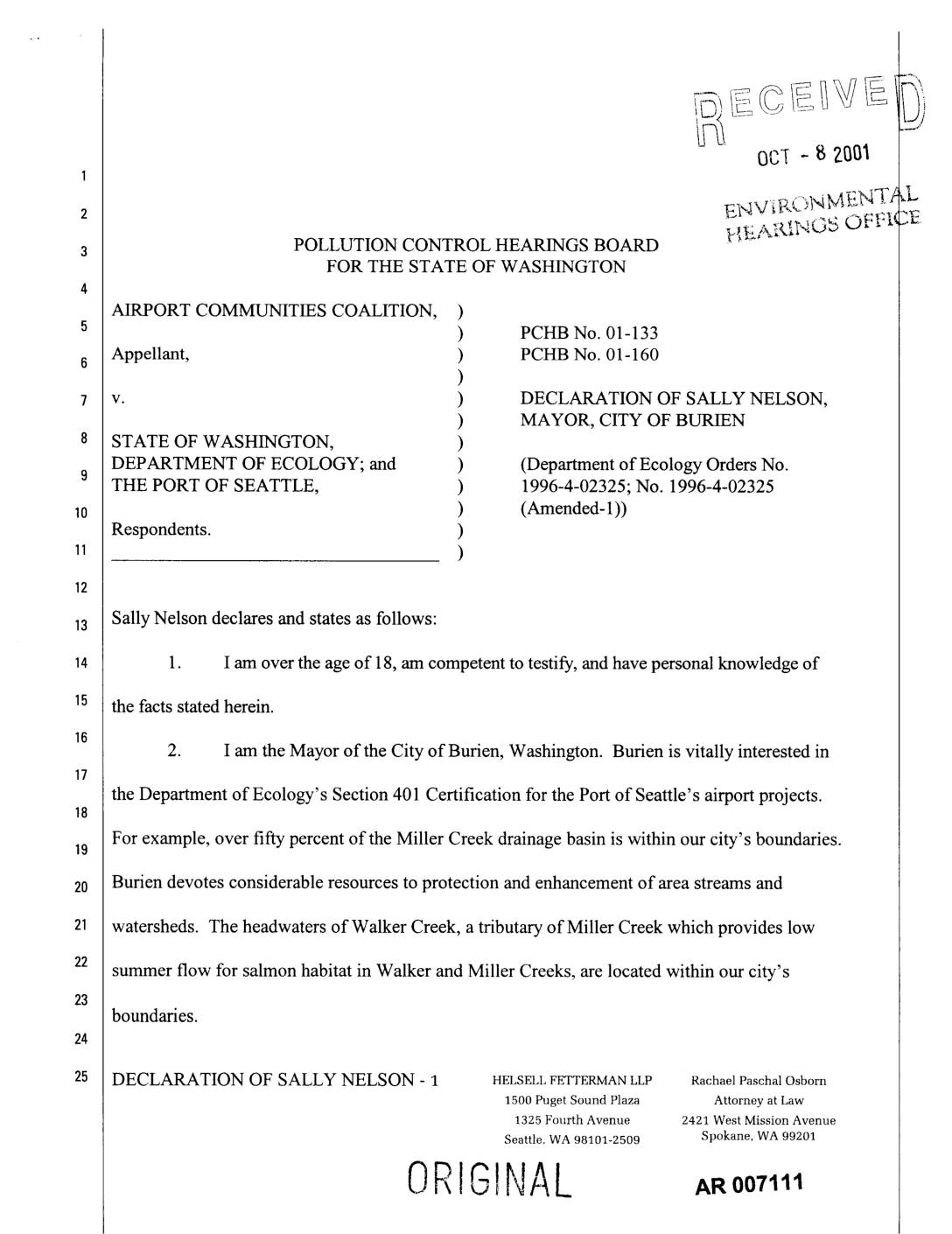 Sally Nelson declares and states as follows: 1. I am over the age of 18, am competent to testify, and have personal knowledge of the facts stated herein. 2. I am the Mayor of the City of Burien, Washington. Burien is vitally interested in the Department of Ecology's Section 401 Certification for the Port of Seattle's airport projects. For example, over fifty percent of the Miller Creek drainage basin is within our city's boundaries.19 Burien devotes considerable resources to protection and enhancement of area streams and watersheds. The headwaters of Walker Creek, a tributary of Miller Creek which provides low summer flow for salmon habitat in Walker and Miller Creeks, are located within our city's boundaries. DECLARATION OF SALLY NELSON - 1 HELSELLFETTERMANLLP RachaelPaschalOsborn 1500 Puget Sound Plaza Attorney at Law 1325 Fourth Avenue 2421 West Mission Avenue Seattle. WA 98101-2509 Spokane, WA 99201 ORIGINAL 3. Because of our concern that the Ecology decision is not well-founded, Burien, as a member of the Airport Communities Coalition, is asking the Pollution Control Hearings Board to -