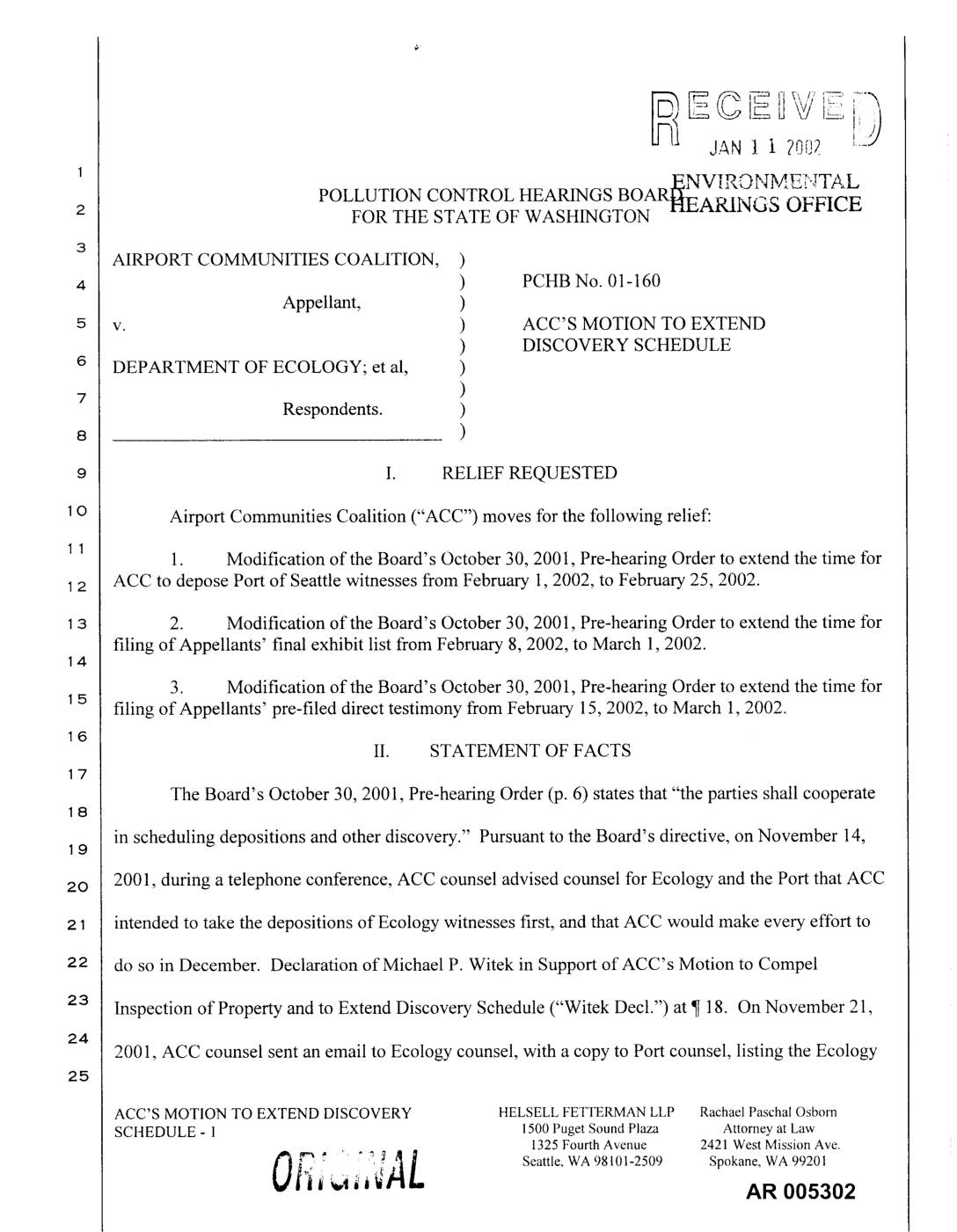 1o Airport Communities Coalition ("ACC") moves for the following relief: 1. Modification of the Board's October 30, 2001, Pre-hearing Order to extend the time for ACC to depose Port of Seattle witnesses from February 1, 2002, to February 25, 2002. 2. Modification of the Board's October 30, 2001, Pre-hearing Order to extend the time for filing of Appellants' final exhibit list from February 8, 2002, to March 1, 2002. 3. Modification of the Board's October 30, 2001, Pre-hearing Order to extend the time for15 filing of Appellants' pre-filed direct testimony from February 15, 2002, to March 1, 2002. II. STATEMENT OF FACTS The Board's October 30, 2001, Pre-hearing Order (p. 6) states that "the parties shall cooperate in scheduling depositions and other discovery." Pursuant to the Board's directive, on November 14,19 2o 2001, during a telephone conference, ACC counsel advised counsel for Ecology and the Port that ACC intended to take the depositions of Ecology witnesses first, and that ACC would make every effort to do so in December. Declaration of Michael P. Witek in Support of ACC's Motion to Compel Inspection of Property and to Extend Discovery Schedule ("Witek Decl.") at ¶ 18. On November 21, 2001, ACC counsel sent an email to Ecology counsel, with a copy to Port counsel, listing the Ecology ACC'S MOTION TO EXTEND DISCOVERY HELSELL FETTERMAN LLP Rachael Paschal Osborn SCHEDULE - 1 1500 Puget Sound Plaza Attorney at Law 1325 Fourth Avenue 2421 West Mission Ave. Ol; ':,ZAL Seattle, WA98101-2509 Spokane, WA99201i AR… -