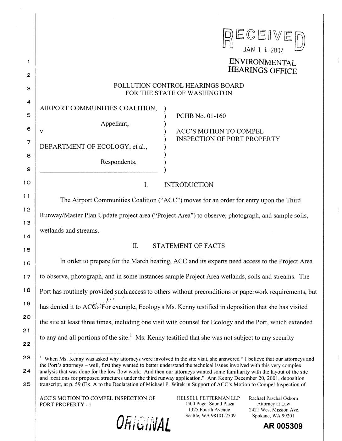The Airport Commtmities Coalition ("ACC") moves for an order for entry upon the Third Runway/Master Plan Update project area ("Project Area") to observe, photograph, and sample soils, wetlands and streams. II. STATEMENT OF FACTS In order to prepare for the March hearing; ACC and its experts need access to the Project Area to observe, photograph, and in some instances sample Project Area wetlands, soils and streams. The Port has routinely provided such.access to others without preconditions or paperwork requirements, but has denied it to AC(%,For example, Ecology's Ms. Kenny testified in deposition that she has visited the site at least three times, including one visit with counsel for Ecology and the Port, which extended to any and all portions of the site. _ Ms. Kenny testified that she was not subject to any security _ When Ms. Kenny was asked why attorneys were involved in the site visit, she answered " I believe that our attorneys and the Port's attorneys - well, first they wanted to better understand the technical issues involved with this very complex analysis that was done for the low flow work. And then our attorneys wanted some familiarity with the layout of the site and locations for proposed structures under the third runway application." Ann Kenny December 20, 2001, deposition transcript, at p. 59 (Ex. A to the Declaration of Michael P. Witek in Support of ACC's Motion to Compel Inspection of ACC'S MOTION TO COMPEL INSPECTION OF HELSELL FETTERMAN LLP Rachael Paschal Osborn PORT PROPERTY… -