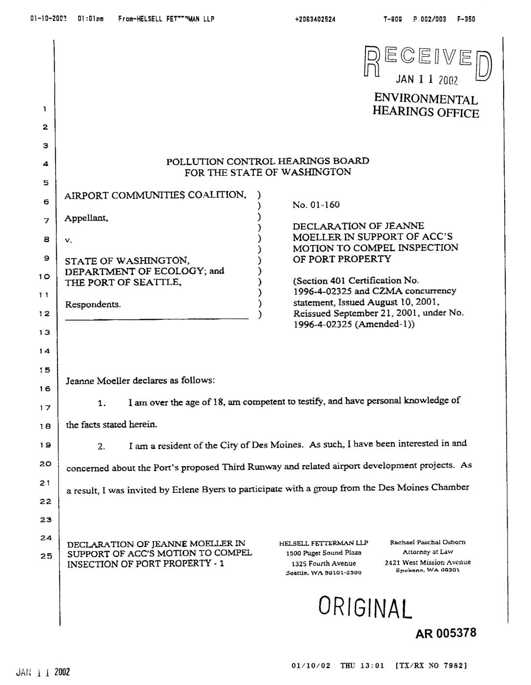 v. ) MOELLER IN SUPPORT OF ACC'S ) MOTION TO COMPEL INSPECTION STATE OF WASHINGTON, ) OF PORT PROPERTY o DEPARTMENT OF ECOLOGY; and ) THE PORT OF SEATTLE, ) (Section 401 Certification No. ) 1996-4-02325 and CZMA concurrency Respondents. ) statement, Issued August 10, 2001, ) Reissued September 21,2001, under No. 1996-4-02325 (Amended- 1)) Jeanne Moeller declares as follows: 1. I am over the age of 18, am competent re testify, and have personal knowledge of17 7o the facts stated herein. 2. I am a resident of the City of Des Moines. As such, I have been interested in and concerned about the Port's proposed Third Runway and related airport development projects. As a result, I was invited by Erlene Byers to participate with a group from the Des Moines Chamber DECLARATION OF JEANNE MOET-I.ER IN HF_.LSELLI-I_yI-ERN4.ANLIP Raehael Paschal Osborn SUPPORT OF ACC'S MOTION TO COMPEL zs00 PugetSound Plaza Attorneyat Law INSECTION OF PORT PROPERTY - 1 1325 Fourth Aveaue 2421 West MissionAvenue _t_e, Y_'A _lO1-ZSO_ _pok_r_n, WA OQoO_ ORIGINAL AR 005378 JAl'4 i 1 2002 01/10/02 TIII.T 13:O1 [TX/RX NO ?982] O]-)O-ZOOZ 01:01pm From-HELSELLFETT¢_MANLLP +2063402524 T-cog P.003/003 F-350 of Commerce inatourof theproposedThirdRunway constructionareaatSeattle-Tacoma InternationalAirportabouta yearago. 3. Priortotakingthetourallthemembers ofthegroupassembledattheterminaltbr lunchand a presentationaboutthcairportina conthrenceroom. 4. ARer lunchand thepresentation,thegroupofapproximately50 personswas6 escortedtoa buswaitingon,theairporttarmac,and thendrivenon a tourneartheareaproposed s forconstructionoftheThirdRunway. 5. I was not asked to and did not sign any paper work prior to going on the site visi_ lo and was no_ subjected to any kind of security procedures prior to going… -