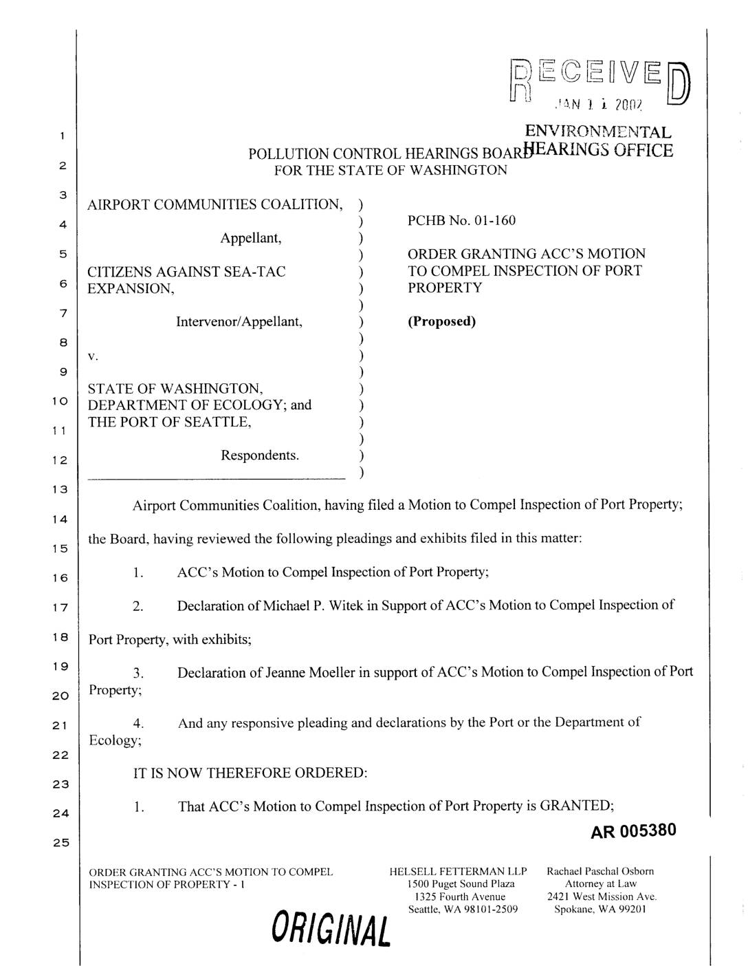 Airport Communities Coalition, having filed a Motion to Compel Inspection of Port Property; the Board, having reviewed the following pleadings and exhibits filed in this matter: 1. ACC's Motion to Compel Inspection of Port Property; 2. Declaration of Michael P. Witek in Support of ACC's Motion to Compel Inspection of Port Property, with exhibits; 3. Declaration of Jeanne Moeller in support of ACC's Motion to Compel Inspection of Port 2o Property; 4. And any responsive pleading and declarations by the Port or the Department of Ecology; IT IS NOW THEREFORE ORDERED: 1. That ACC's Motion to Compel Inspection of Port Property is GRANTED;24 AR 005380 ORDER GRANTING ACC'S MOTION TO COMPEL HELSELL FETTERMAN LLP Rachael Paschal Osborn INSPECTION OF PROPERTY - 1 1500 Puget Sound Plaza Attorney at Law 1325 Fourth Avenue 2421 West Mission Ave. Seattle, WA 98101-2509 Spokane, WA 99201 ORIGINAL 2. That the Port of Seattle will, within two days of this Order, confer in good faith with ACC counsel and agree dates for site visits for ACC's experts, counsel, paralegal, and two client representatives, to observe, photograph and sample wetlands, soils and streams within the area proposed for construction of the Third Runway and related Master Plan Update Projects; 3. That no depositions shall be taken of ACC witnesses until fourteen days after the site visits; and 4. That, if the Port fails to reach agreement on dates for entry with ACC within two days of the date of this Order, then ACC shall notify the… -