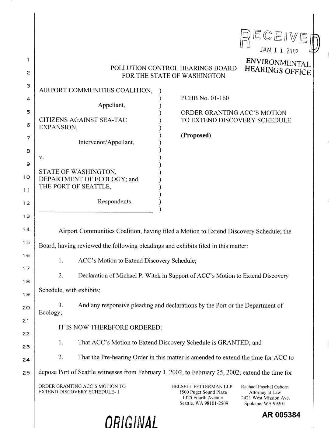 Airport Communities Coalition, having filed a Motion to Extend Discovery Schedule; the Board, having reviewed the following pleadings and exhibits filed in this matter: 1. ACC's Motion to Extend Discovery Schedule; 2. Declaration of Michael P. Witek in Support of ACC's Motion to Extend Discovery Schedule, with exhibits; zo 3. And any responsive pleading and declarations by the Port or the Department of Ecology; IT IS NOW THEREFORE ORDERED: 1. That ACC's Motion to Extend Discovery Schedule is GRANTED; and 2. That the Pre-hearing Order in this matter is amended to extend the time for ACC to depose Port of Seattle witnesses from February 1, 2002, to February 25, 2002; extend the time for ORDER GRANTING ACC'S MOTION TO HELSELL FETTERMAN LLP Rachael Paschal Osborn EXTEND DISCOVERY SCHEDULE- 1 1500 Puget Sound Plaza Attorney at Law 1325 Fourth Avenue 2421 West Mission Ave. Seattle, WA 98101-2509 Spokane, WA 99201 ORIhVAL AR 005384 filing of ACC's final exhibit list from February 8, 2002, to March 1, 2002; and extend the time for filing of ACC's pre-filed direct testimony from February 15, 2002, to March 1, 2002. SO ORDERED this day of ,2002. POLLUTION CONTROL HEARINGS BOARD KALEEN COTTINGHAM, Presiding [ 1o ROBERT V. JENSEN, Member Presented by: HELSELL FETTERM_ LLP , A w Peter J. Eglick, W_BA No. 8809 Kevin L. Stock, WSBA No. 14541 / Michael P. Witek, WSB,_I_Io. 26fi98 RaPhael Paschal _rn, WSBA No. 2-i-0f8 Attorneys for Airport Communities Coalition Approved as to Form; Notice of Presentation Waived: PORT… -