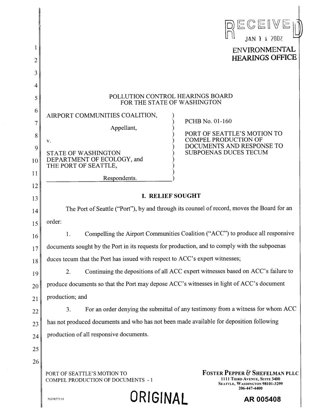 The Port of Seattle ("Port"), by and through its counsel of record, moves the Board for an order: 1. Compelling the Airport Communities Coalition ("ACC") to produce all responsive documents sought by the Port in its requests for production, and to comply with the subpoenas duces tecum that the Port has issued with respect to ACC's expert witnesses; 2. Continuing the depositions of all ACC expert witnesses based on ACC's failure to produce documents so that the Port may depose ACC's witnesses in light of ACC's document production; and 3. For an order denying the submittal of any testimony from a witness for whom ACC has not produced documents and who has not been made available for deposition following production of all responsive documents. PORT OF SEATTLE'S MOTION TO FOSTER PEPPER _' SHEFELMAN PLLC COMPEL PRODUCTION OF DOCUMENTS - 1 1111 THIRDAVENUE,SUITE3400 SEATTLE, WASHINGTON 98101-3299 206-447-4400 ORIGINAL AR 005408 II. BACKGROUND FACTS The Port propounded its first set of Interrogatories and Requests for Production on November 9, 2001. A copy of those discovery requests is attached to the Third Declaration of Steven G. Jones ("Third Jones Dec.") as Exhibit A. ACC served the Port with its responses and objections to the Port's discovery requests on December 10, 2001. A copy of ACC's objections and responses is attached to the Third Jones Dec. as Exhibit B. In its Requests, the Port asked for "all documents relied on or reviewed to form the basis of the opinions, facts, or other testimony referenced… -