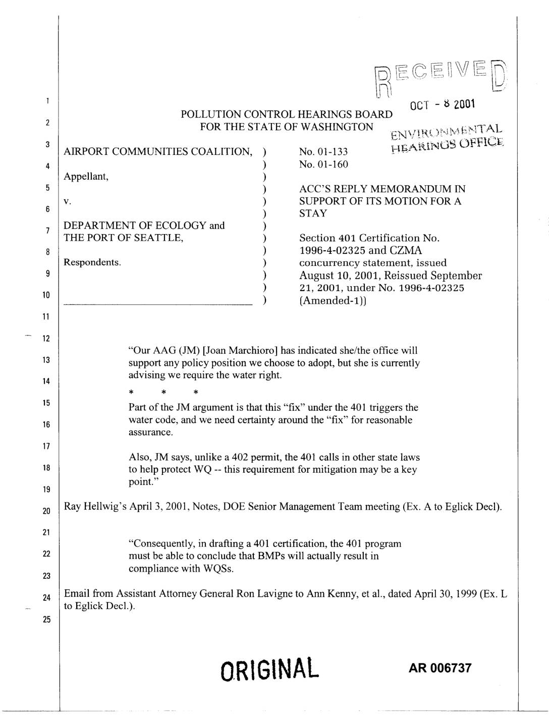 FOR THE STATE OF WASHINGTON -,-_,,,,, _ _ -,_ tM _i__'qTAL AIRPORT COMMUNITIES COALITION, ) No. 01-133 _|_:¢t_iI'qU " OFF][_II_, ) No. 01-160 Appellant, ) ) ACC'S REPLY MEMORANDUM IN v. ) SUPPORT OF ITS MOTION FOR A ) STAY DEPARTMENT OF ECOLOGY and )7 THE PORT OF SEATTLE, ) Section 401 Certification No. ) 1996-4-02325 and CZMA Respondents. ) concurrency statement, issued ) August 10, 2001, Reissued September ) 21, 2001, under No. 1996-4-02325 ) (Amended-I)) "'Our AAG (JM) [Joan Marchioro] has indicated she/the office will support any policy position we choose to adopt, but she is currently advising we require the water right. Part of the JM argument is that this "fix" under the 401 triggers the water code, and we need certainty around the "fix" for reasonable assurance. Also, JM says, unlike a 402 permit, the 401 calls in other state laws to help protect WQ -- this requirement for mitigation may be a key point." 2o Ray Hellwig's April 3, 2001, Notes, DOE Senior Management Team meeting (Ex. A to Eglick Decl). "Consequently, in drafting a 401 certification, the 401 program must be able to conclude that BMPs will actually result in compliance with WQSs.23 Email from Assistant Attorney General Ron Lavigne to Ann Kenny, et al., dated April 30, 1999 (Ex. L to Eglick Decl.). ORIGINAL INTRODUCTION Section401 of the Clean Water Act requires the state to certify that there is reasonable assurance that a proposal will not result in violation of state water quality…