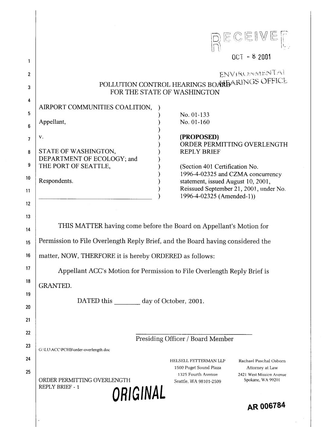THE PORT OF SEATTLE, ) (Section 401 Certification No. ) 1996-4-02325 and CZMA concurrency Respondents. ) statement, issued August 10, 2001, ) Reissued September 21,200], under No o ) 1996-4-02325 (Amended-I)) THIS MATTERhaving come before the Board on Appellant's Motion for14 Permission to File Overlength Reply Brief, and the Board having considered the matter, NOW, THERFORE it is hereby ORDERED as follows: Appellant ACC's Motion for Permission to File Overlength Reply Brief is GRANTED. DATED this day of October, 2001. Presiding Officer / Board Member G:LUkACCkPCHBorder-overlength.doc HELSELL FETTERMAN LLP Rachael Paschal Osborn 1500 Puget Sound Plaza Attorney at Law 1325 Fourth Avenue 2421 West Missien Avenue ORDER PERMITTING OVERLENGTtt Seattle, WA 98101-2509 Spokane, WA 99201 REPLY BRIEF - 1 ORIGINAL AR 006784 OCt! - 8, 2001 EN Vi ).(L,_i_iv__i I-I_ARING5 0FFIq POLLUTION CONTROL HEARINGS BOARD FOR THE STATE OF WASHINGTON AIRPORT COMMUNITIES COALITION, ) ) No. 01-133 Appellant, ) No. 01-160 ) -
