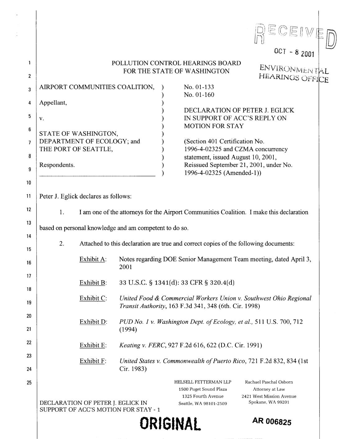 FOR THE STATE OF WASHINGTON ENVtRONM_m4 ; HEARINGS Of:F] AIRPORT COMMUNITIES COALITION, ) No. 01-133 ) No. 01-160 Appellant, ) ) DECLARATION OF PETER J. EGLICK v. ) IN SUPPORT OF ACC'S REPLY ON ) MOTION FOR STAY STATE OF WASHINGTON, ) DEPARTMENT OF ECOLOGY; and ) (Section 401 Certification No. THE PORT OF SEATTLE, ) 1996-4-02325 and CZMA concurrency ) statement, issued August 10, 2001, Respondents. ) Reissued September 21, 2001, under No. ) 1996-4-02325 (Amended-l)) Peter J. Eglick declares as follows: 1. I am one of the attomeys for the Airport Communities Coalition. I make this declaration based on personal knowledge and am competent to do so. 2. Attached to this declaration are true and correct copies of the following documents: Exhibit A: Notes regarding DOE Senior Management Team meeting, dated April 3,16 2001 Exhibit B: 33 U.S.C. § 1341(d): 33 CFR § 320.4(d) Exhibit C: United Food & Commercial Workers Union v. Southwest Ohio Regional Transit Authority, 163 F.3d 341,348 (6th. Cir. 1998) Exhibit D: PUD No. 1 v. Washington Dept. of Ecology, et al., 511 U.S. 700, 712 (1994) Exhibit E: Keating v. FERC, 927 F.2d 616, 622 (D.C. Cir. 1991) Exhibit F: United States v. Commonwealth of Puerto Rico, 721 F.2d 832, 834 (1st Cir. 1983) HELSELL FETTERMAN LLP Rachael Paschal Osborn 1500 Puget Sound Plaza Attorney at Law 1325 Fourth Avenue 2421 West Mission Avenue DECLARATION OF PETER J. EGLICKIN Seattle,WA98101-2509 Spokane,WA 99201 SUPPORT OF ACC'S MOTION FOR STAY - 1 ORI61NAL Exhibit G:… -