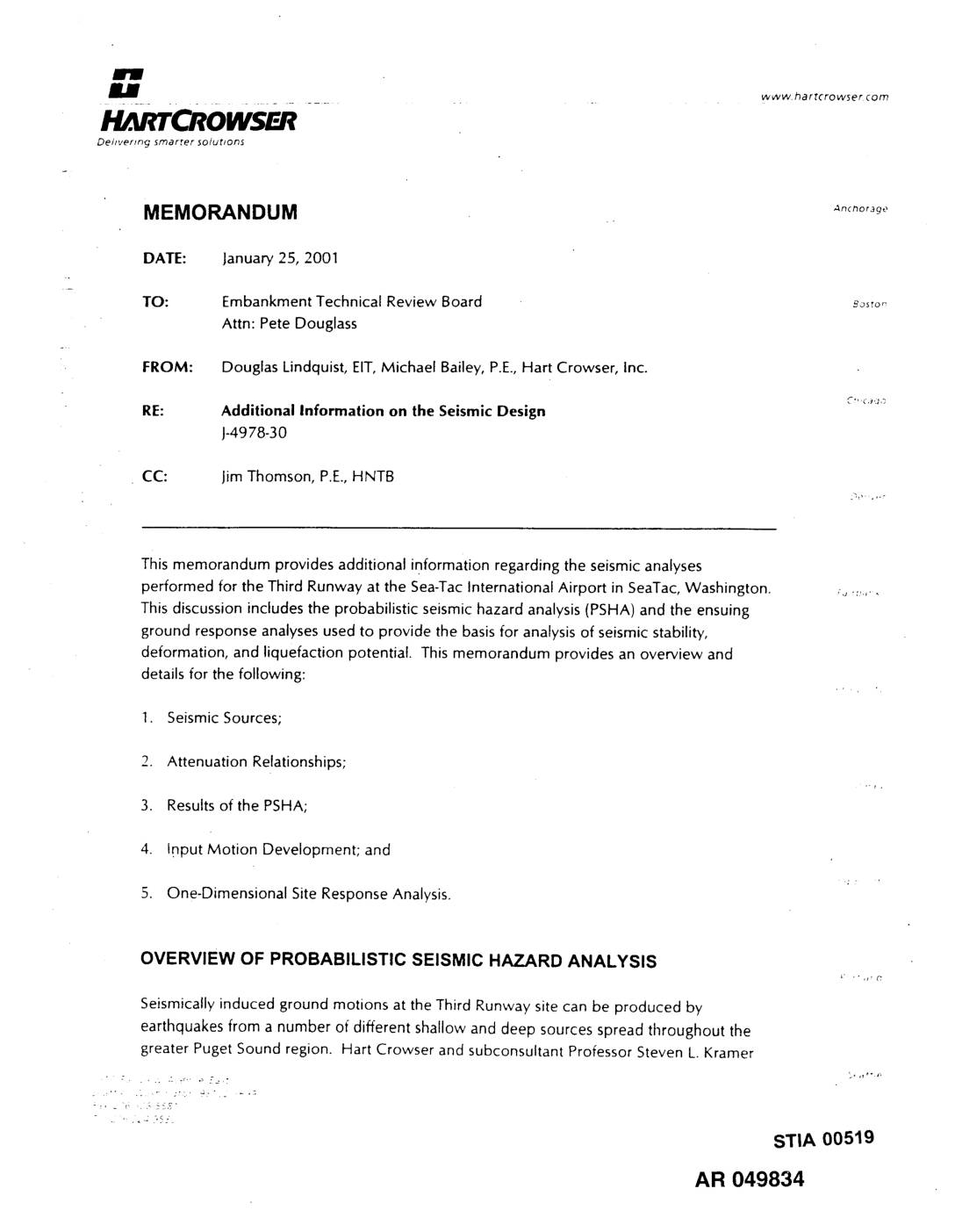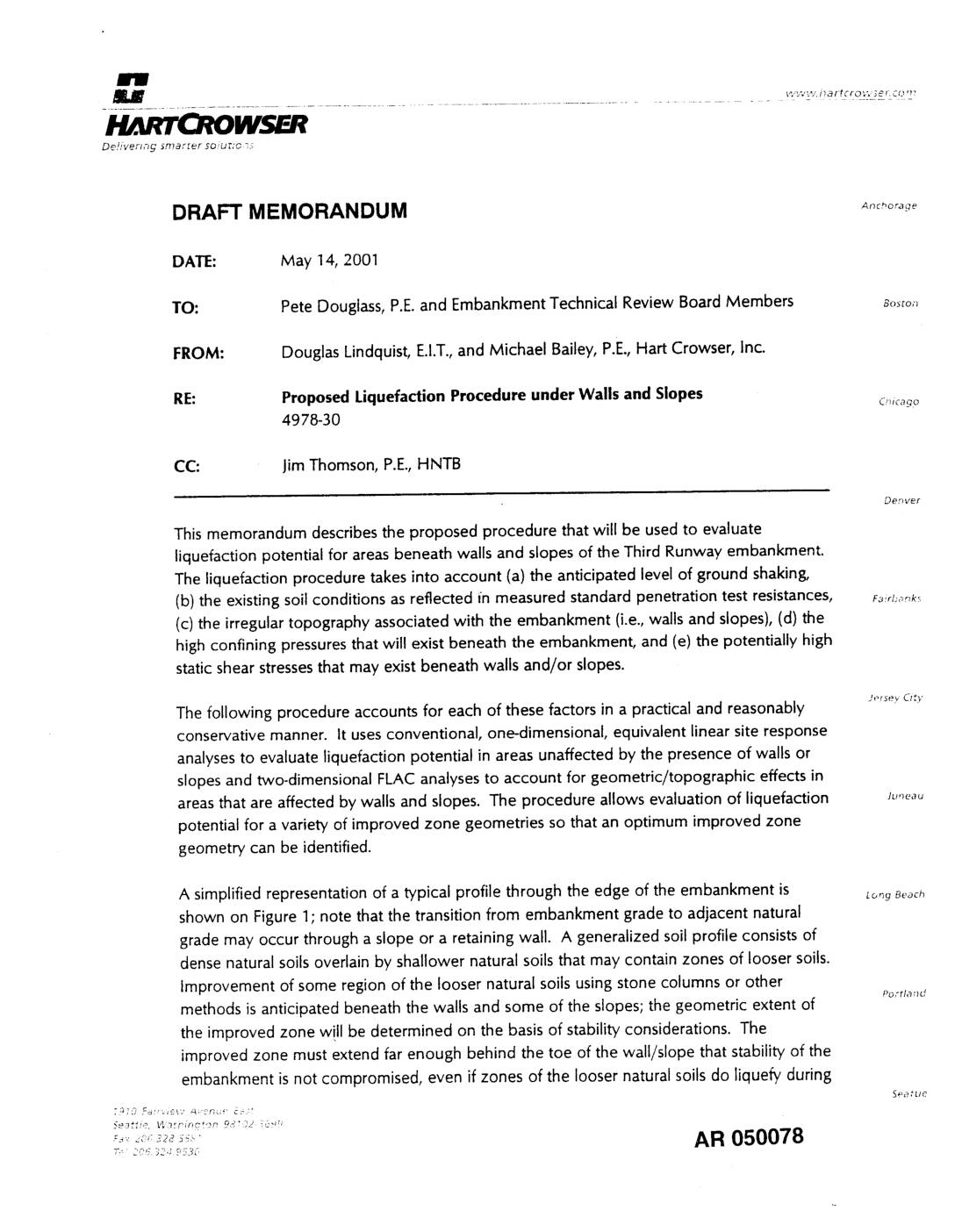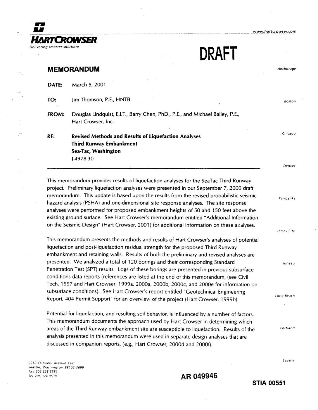 FROM: Douglas Lindquist, E.I.T., Barry Chen, PhD., P.E., and Michael Bailey, P.E., Hart Crowser, Inc. - RE: Revised Methods and Results of Liquefaction Analyses ch,c_go Third Runway Embankment SeaoTac,Washington J-4978-30 Denver This memorandum provides results of liquefaction analyses for the SeaTac Third Runway project. Preliminary liquefaction analyses were presented in our September 7, 2000 draft memorandum. This update is based upon the results from the revised probabilistic seismic Falrbanks hazard analysis (PSHA) and one-dimensional site response analyses. The site response analyses were performed for proposed embankment heights of 50 and 150 feet above the existing ground surface. See Hart Crowser's memorandum entitled "Additional Information on the Seismic Design" (Hart Crowser, 2001 ) for additional information on these aqalyses. Jer',eV City This memorandum presents the methods and results of Hart Crowser's analyses of potential liquefaction and post-liquefaction residual strength for the proposed Third Runway embankment and retaining walls. Results of both the preliminary and revised analyses are presented. We analyzed a total of 120 borings and their corresponding Standard Joneau Penetration Test (SPT) results. Logs of these borings are presented in previous subsurface conditions data reports (references are listed at the end of this memorandum, (see Civil Tech, 1997 and Hart Crowser, 1999a, 2000a, 2000b, 2000c, and 2000e for information on subsurface conditions). See Hart Crowser's report entitled "Geotechnical Engineering Lorrq Beach Report, 404 Permit Support" for an overview of the project (Hart Crowser, 1999b). Potential for liquefaction, and resulting soil behavior, is influenced by a number of factors. This memorandum… -