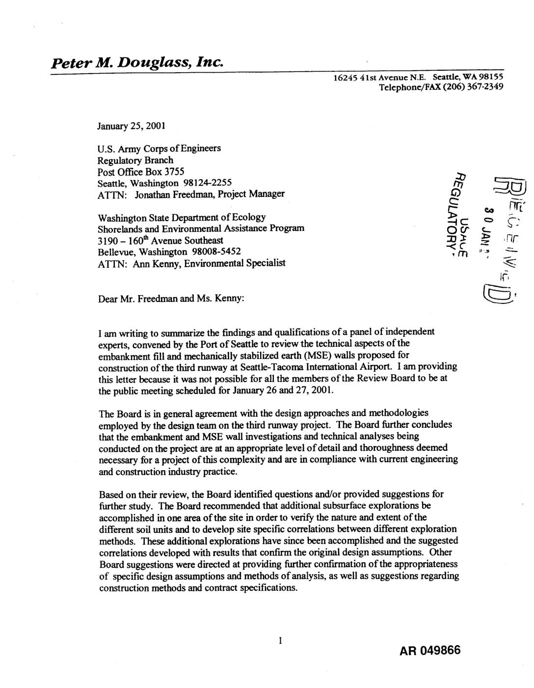 Seattle, Washington 98124-2255 _ATTN: Jonathan Freedmart, Project Manager __ Washington State Department of Ecology _ _, Shorelands and Environmental Assistance Program O _t" _:_ 3190 - 160_ Avenue Southeast _ 3: _!'_/7 Bellevue, Washington 98008-5452 , tTi "-" ATTN: Ann Kenny, Environmental Specialist _- Dear Mr. Freedman and Ms. Kenny: _' am writing to summarizethe findings and qualifications of a panel of independent experts, convened by the Port of Seattle to review the technical aspects of the embankmentfill and mechanically stabilized earth (MSE) walls proposed for constructionof the thirdrunway at Seattle-Tacoma InternationalAirport. I am providing this letter because it was not possible for all the members of the Review Board to be at the public meeting scheduled for January26 and27, 2001. The Board is in general agreement with the design approaches and methodologies employed by the design team on the third runway project. The Board further concludes that the embankment and MSE wall investigations and technical analyses being conducted on the project are at an appropriate level of detail and thoroughness deemed necessary for a project of this complexity and are in compliance with current engineering and construction industry practice. Based on their review, the Board identified questions and/or provided suggestions for further study. The Board recommended that additional subsurface explorations be accomplished in one area of the site in order to verify the nature and extent of the different soil units and to develop site specific correlations between different exploration methods. These additional explorations have since been accomplished and… -