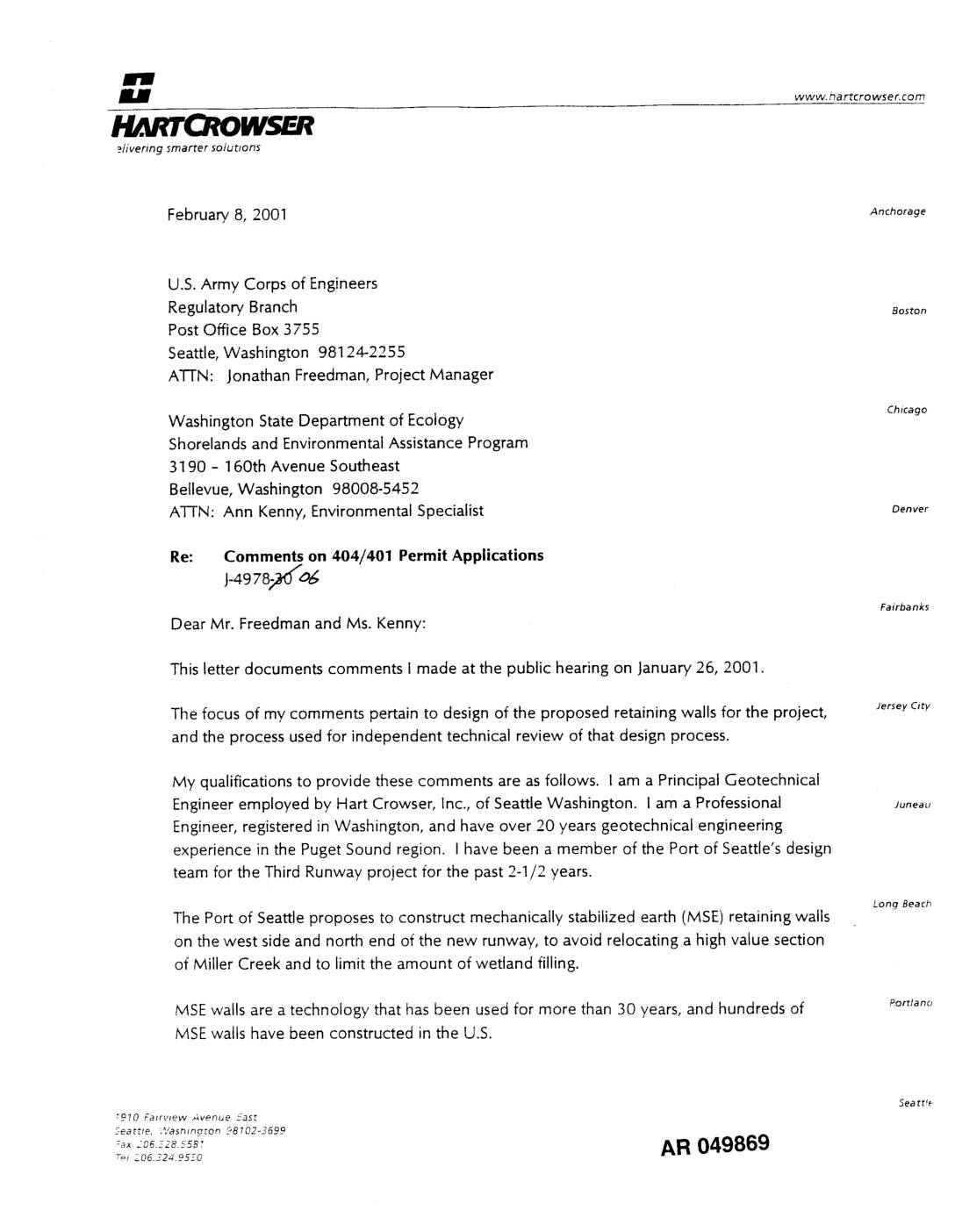 This letter documents comments I made at the public hearing on January 26, 2001. The focus of my comments pertain to design of the proposed retaining walls for the project, JerseyCity and the process used for independent technical review of that design process. My qualifications to provide these comments are as follows. I am a Principal Geotechnical Engineer employed by Hart Crowser, Inc., of Seattle Washington. I am a Professional Juneau Engineer, registered in Washington, and have over 20 years geotechnical engineering experience in the Puget Sound region. I have been a member of the Port of Seattle's design team for the Third Runway project for the past 2-1/2 years. Long Beach The Port of Seattle proposes to construct mechanically stabilized earth (MSE) retaining walls on the west side and north end of the new runway, to avoid relocating a high value section of Miller Creek and to limit the amount of wetland filling. MSEwalls are a technology that has been used for more than 30 years, and hundreds of Porrtancl MSEwalls have been constructed in the U.S. 5eatt_- 19!0 Fairv_ew Avenue East 5eattte, "%,'asning_on _8102-3599 AR 049869T=i 206.324.9550 [r L U.S. Army Corps of Engineersand Washington State Department of Eco[ogy J4978-30 February 8, 2001 Page 2 The MSEwalls proposed by the Port of Seattle range in height from 50 to 135 feet; there are higher MSEwalls that have been built elsewhere, the technology performs well. Prior to starting design of any walls, the Port of Seattle reviewed eight different… -