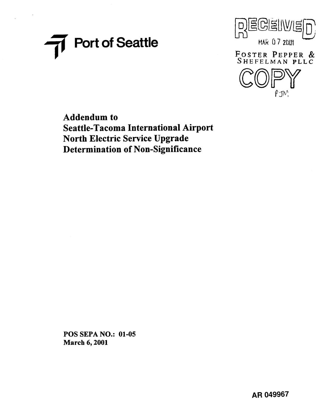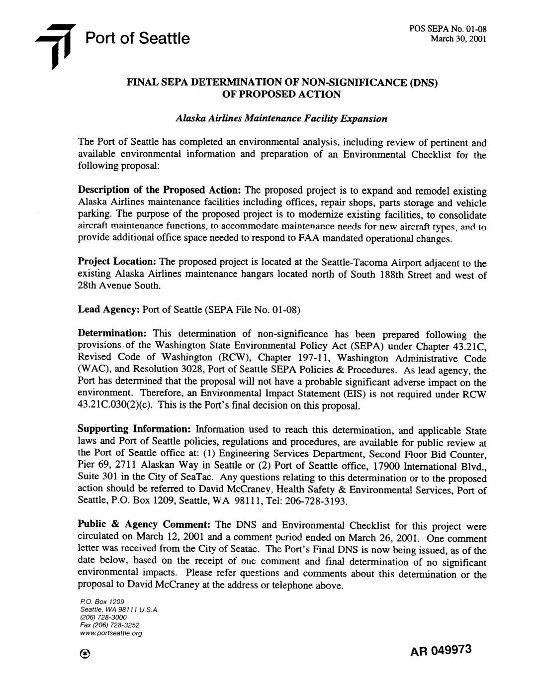Port of Seattle POS SEPA No. 0]-08 March 30,2001 FINAL SEPA DETERMINATION OF NON-SIGNIFICANCE (DNS) OF PROPOSED ACTION Alaska Airlines 31aintenance Facility Expansion The Port of Seattle has completed an environmental analysis, including review of pertinent and available environmental information and preparation of an Environmental Checklist for the following proposal: Description of the Proposed Action: The proposed project is to expand and remodel existing Alaska Airlines maintenance facilities including offices, repair shops, parts storage and vehicle parking. The purpose of the proposed project is to modernize existing facilities, to consolidate aircraft maintenance fimctions, to accommodate maintenance nee.ds for new aircr,'fft type.% and to provide additional office space needed to respond to FAA mandated operational changes. Project Location: The proposed project is located at the Seattle-Tacoma Airport adjacent to the existing Alaska Airlines maintenance hangars located north of South 188th Street and west of 28th Avenue South. Lead Agency: Port of Seattle (SEPA File No. 01-08) Determination: This determination of non-significance has been prepared following the provisions of the Washington State Environmental Policy Act (SEPA) under Chapter 43.21C, Revised Code of Washington CRCW), Chapter 197-11, Washington Administrative Code (WAC), and Resolution 3028, Port of Seattle SEPA Policies & Procedures. As lead agency, the Port has determined that the proposal will not have a probable significant adverse impact on the environment. Therefore, an Environmental Impact Statement (EIS) is not required under RCW 43.21 C.030(2)(c). This is the Port's final decision on this proposal. Supporting Information: Information used to reach this determination, and… -