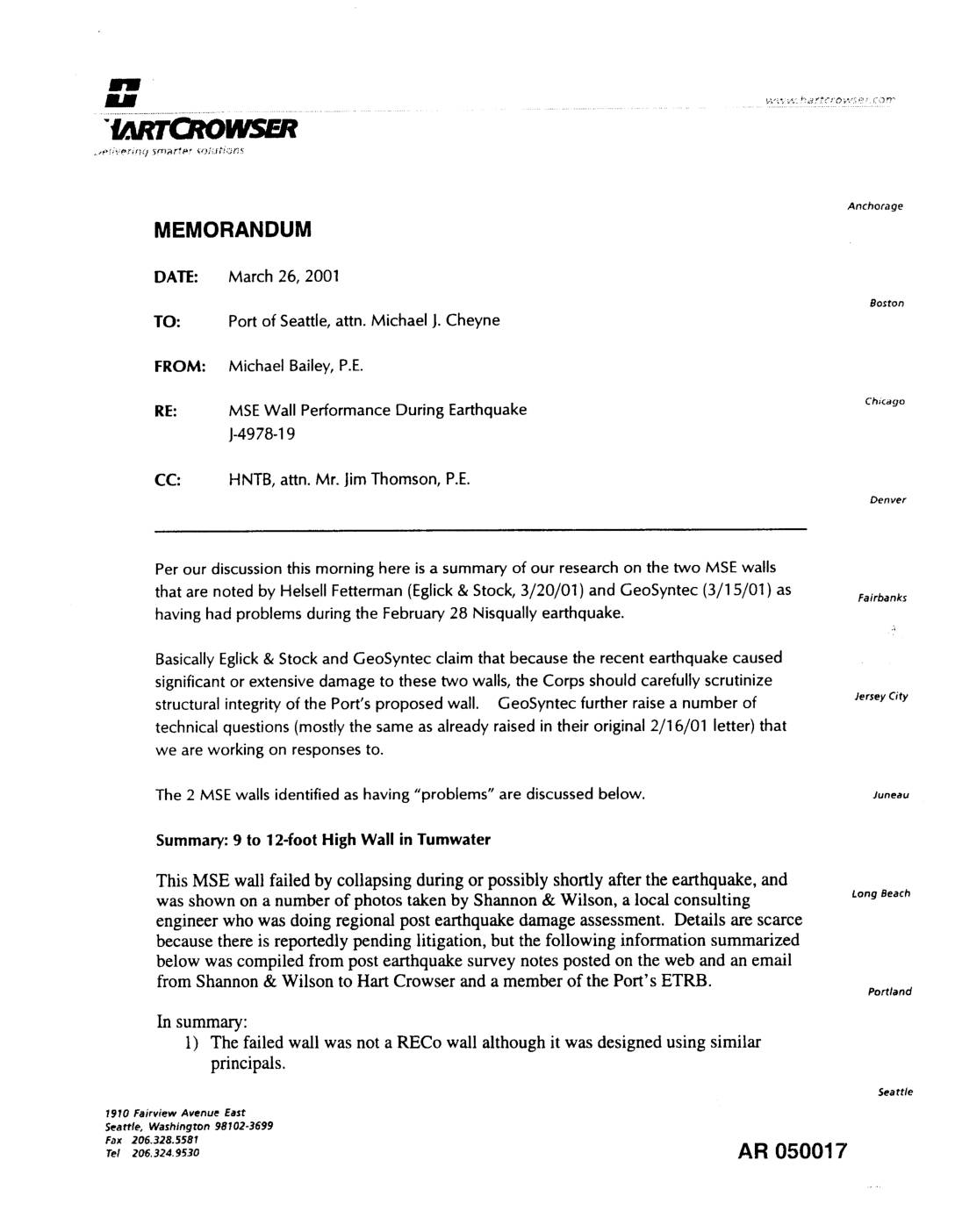 TO: Port of Seattle, attn. Michael J. Cheyne FROM: Michael Bailey, P.E. RE: MSE Wall Performance During Earthquake ch,c_o J-4978-19 CC: HNTB,attn.Mr. JimThomson,P.E. Denver Per our discussion this morning here is a summary of our research on the two MSE walls that are noted by Helsell Fetterman (Eglick & Stock, 3/20/01) and GeoSyntec (3/15/01 ) as Fairbanks having had problems during the February 28 Nisqually earthquake. "! Basically Eglick & Stock and GeoSyntec claim that because the recent earthquake caused significant or extensive damage to these two walls, the Corps should carefully scrutinize structural integrity of the Port's proposed wall. GeoSyntec further raise a number of JerseyCity technical questions (mostly the same as already raised in their original 2/16/01 letter) that we are working on responses to. The 2 MSE walls identified as having "problems" are discussed below, s_neau Summary: 9 to 12-foot High Wall in Tumwater This MSE wall failed by collapsing during or possibly shortly after the earthquake, and was shown on a number of photos taken by Shannon & Wilson, a local consulting tongBeach engineer who was doing regional post earthquake damage assessment. Details are scarce because there is reportedly pending litigation, but the following information summarized below was compiled from post earthquake survey notes posted on the web and an email from Shannon & Wilson to Hart Crowser and a member of the Port's ETRB. Portland In summary: 1) The failed wall was not a RECo wall although it was designed using similar principals. Seattle 1970… -