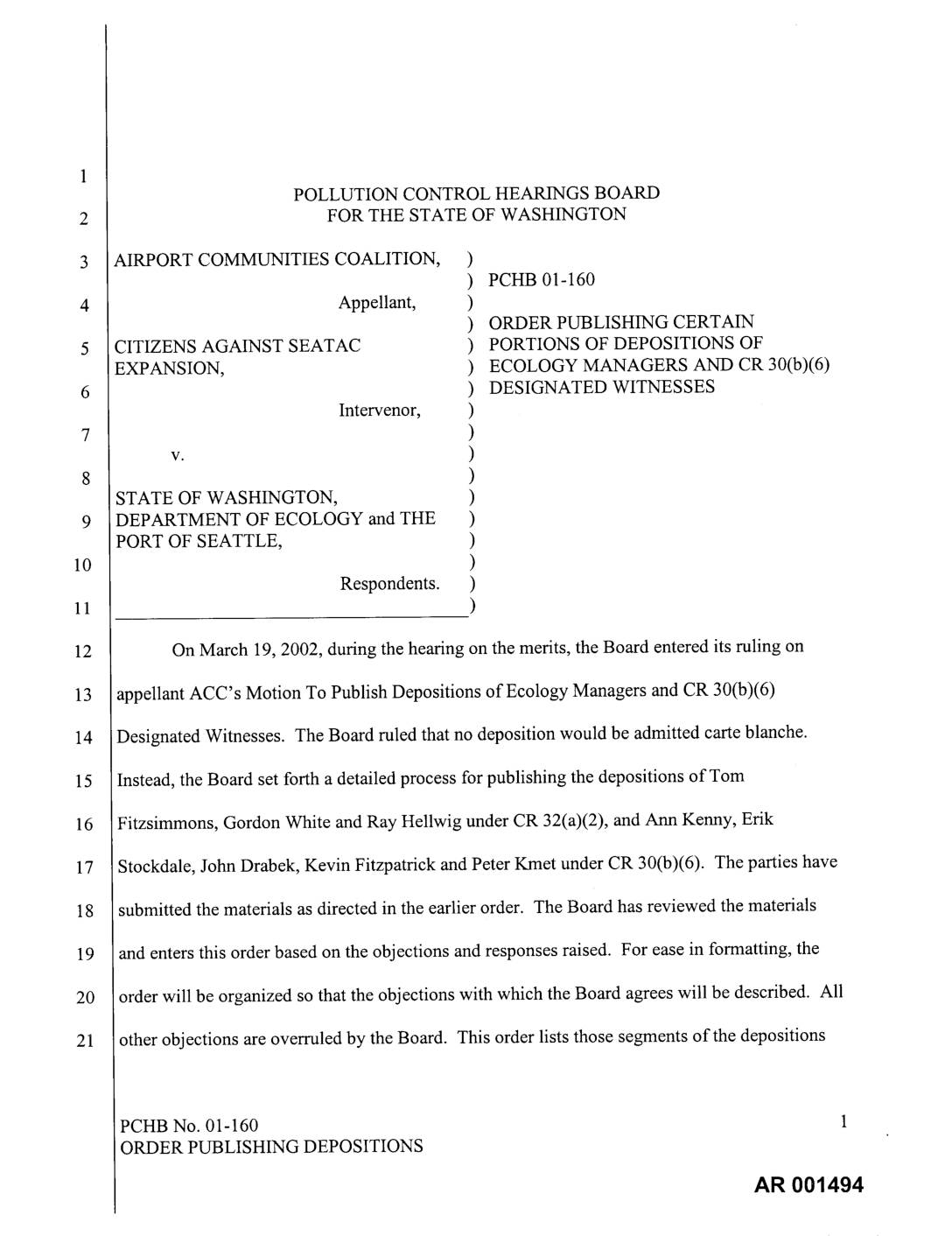 EXPANSION, ) ECOLOGY MANAGERS AND CR 30(b)(6) ) DESIGNATED WITNESSES Intervenor, ) ) v. ) ) STATE OF WASHINGTON, ) DEPARTMENT OF ECOLOGY and THE ) PORT OF SEATTLE, ) ) Respondents. ) ) On March 19, 2002, during the hearing on the merits, the Board entered its ruling on appellant ACC's Motion To Publish Depositions of Ecology Managers and CR 30(b)(6) Designated Witnesses. The Board ruled that no deposition would be admitted carte blanche. Instead, the Board set forth a detailed process for publishing the depositions of Tom Fitzsimmons, Gordon White and Ray Hellwig under CR 32(a)(2), and Ann Kenny, Erik Stockdale, John Drabek, Kevin Fitzpatrick and Peter Kmet under CR 30(b)(6). The parties have submitted the materials as directed in the earlier order. The Board has reviewed the materials and enters this order based on the objections and responses raised. For ease in formatting, the order will be organized so that the objections with which the Board agrees will be described. All other objections are overruled by the Board. This order lists those segments of the depositions PCHB No. 01-160 1 ORDER PUBLISHING DEPOSITIONS AR 001494 that are admitted. Attached to this order is a copy of each of the depositions clearly showing those portions that are not admitted. OBJECTIONS John Drabek: All Objections were overruled on Mr. Drabek's deposition. Kevin Fitzpatrick: The following objections were upheld on Mr. Fitzpatrick's deposition: FROM TO REASON Page 62, line 19 page 63, line 1 Foundation, speculation. Page 79, line 18…