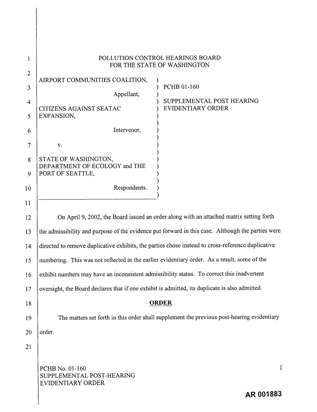 On April 9, 2002, the Board issued an order along with an attached matrix setting forth the admissibility and purpose of the evidence put forward in this case. Although the parties were directed to remove duplicative exhibits, the parties chose instead to cross-reference duplicative numbering. This was not reflected in the earlier evidentiary order. As a result, some of the exhibit numbers may have an inconsistent admissibility status. To correct this inadvertent oversight, the Board declares that if one exhibit is admitted, its duplicate is also admitted. ORDER The matters set forth in this order shall supplement the previous post-heating evidentiary order. PCHB No. 01-160 1 SUPPLEMENTAL POST-HEARING EVIDENTIARY ORDER AR 001883 SO ORDERED this _-" day of t_Crl _ , 2002. POLLUTION CONTROL HEARINGS BOARD Presiding PCHB No. 01-160 2 SUPPLEMENTAL POST-HEARING EVIDENTIARY ORDER AR 001884 -