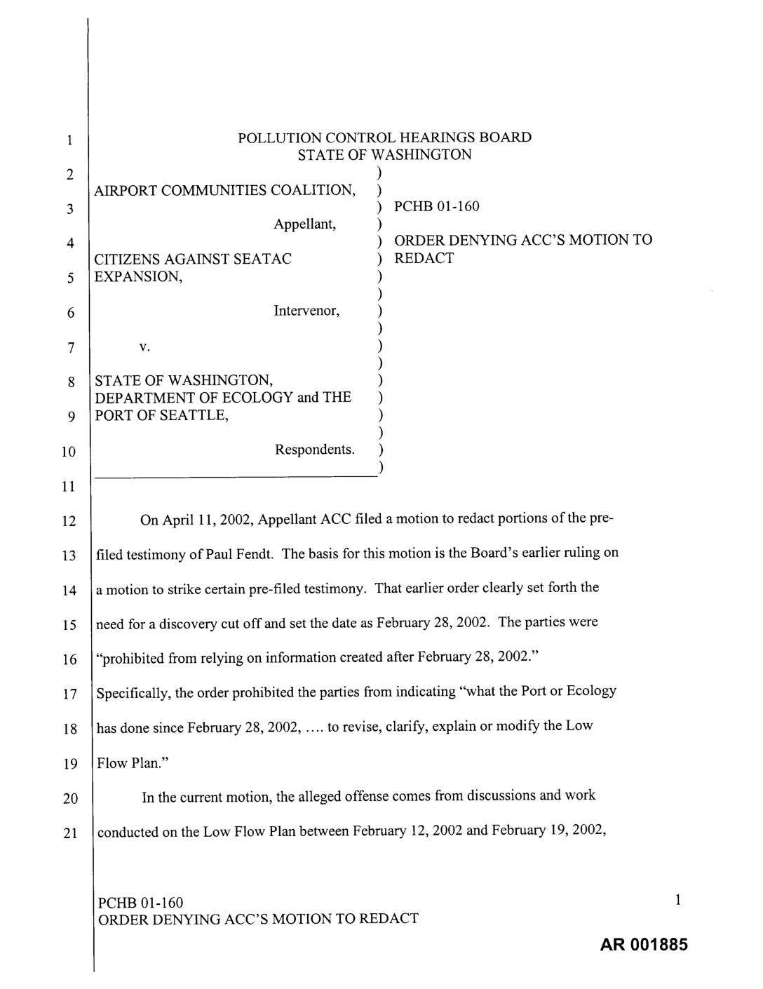 On April 11, 2002, Appellant ACC filed a motion to redact portions of the pre- filed testimony of Paul Fendt. The basis for this motion is the Board's earlier ruling on a motion to strike certain pre-filed testimony. That earlier order clearly set forth the need for a discovery cut off and set the date as February 28, 2002. The parties were "prohibited from relying on information created after February 28, 2002." Specifically, the order prohibited the parties from indicating "what the Port or Ecology has done since February 28, 2002, .... to revise, clarify, explain or modify the Low Flow Plan." In the current motion, the alleged offense comes from discussions and work conducted on the Low Flow Plan between February 12, 2002 and February 19, 2002, PCHB 01-160 1 ORDER DENYING ACC'S MOTION TO REDACT AR 001885 but which did not get collected and delivered until March 6, 2002, after the discovery cut-off noted above. This case is complicated by the changing documentation resulting from on- going work on various aspects of the required mitigation plans at the airport. Although the intent of these modifications appears to be to make the plans better, these efforts impair the ability of the Board or the other parties to know the current status of each plan. The purpose of a bright-line discovery cut-off is to make relevant information available to the litigants in a timely fashion. The situation created by Mr. Fendt's material is not as clearly violative of the Board's… -