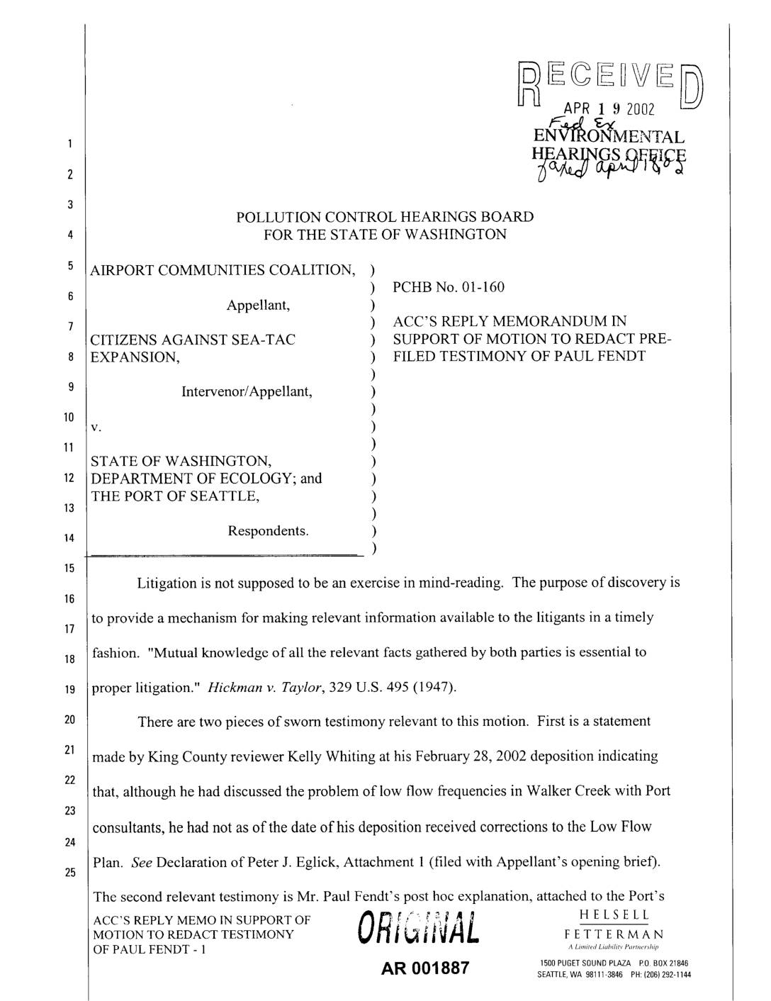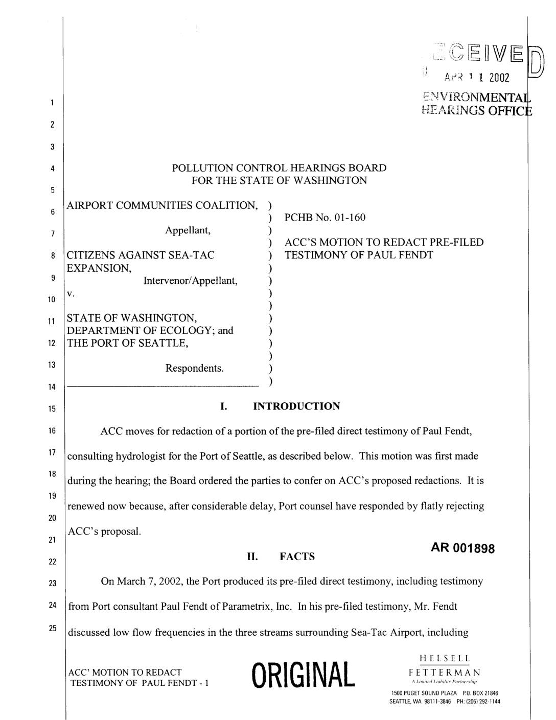 ACC moves for redaction of a portion of the pre-filed direct testimony of Paul Fendt, consulting hydrologist for the Port of Seattle, as described below. This motion was first made during the hearing; the Board ordered the parties to confer on ACC's proposed redactions. It is renewed now because, after considerable delay, Port counsel have responded by flatly rejecting ACC's proposal. AN 001898 II. FACTS On March 7, 2002, the Port produced its pre-filed direct testimony, including testimony from Port consultant Paul Fendt of Parametrix, Inc. In his pre-filed testimony, Mr. Fendt discussed low flow frequencies in the three streams surrounding Sea-Tac Airport, including HELSELL ACC' MOTION TO REDACT ORIGINAL FETTERMANTESTIMONY OF PAUL FENDT - 1 ALimitedLiabilityP(........."dlip 1500PUGETSOUNDPLAZA EO.BOX21846 SEA_I-LE,WA 98111-3846 PH:(206) 292-I144 Walker Creek. Among other assertions, Mr. Fendt stated at paragraph 42 that, "In Walker Creek, of the 47 low flows occurred between August 7 and November 9." Pre-Filed Direct Testimony of Paul S. Fendt, P.E. ("Fendt Pre-Filed") at p. 11, lines 18-19. ACC moves for the redaction of that sentence. Mr. Fendt also attached to his pre-filed testimony a chart providing a graphical representation of Walker Creek low flow frequencies. Fendt Pre-Filed at Exhibit C,6 third page ("7-Day Low Flow Occurrences in Walker Creek, 1949-1995 (1994 HSPF)"). ACC moves for the redaction of all of Exhibit C to the Fendt Pre-Filed Testimony. Questions about the version of the Walker Creek chart in the December 2001 Low Flow Plan had been raised by Ecology reviewer Kelly Whiting in… -
