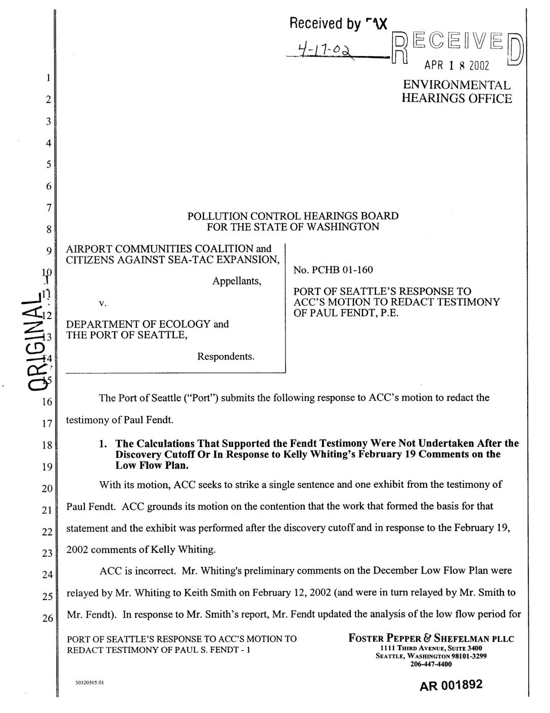 _ v. ACC'S MOTION TO REDACT TESTIMONY _12 OF PAUL FENDT, P.E. DEPARTMENT OF ECOLOGY and3 THE PORT OF SEATTLE, ¢.D ---_4 Respondents. cY The Port of Seattle ("Port") submits the following response to ACC's motion to redact the testimony of Paul Fendt. 1. The Calculations That Supported the Fendt Testimony Were Not Undertaken After the Discovery Cutoff Or In Response to Kelly Whiting's February 19 Comments on the Low Flow Plan. With its motion, ACC seeks to strike a single sentence and one exhibit from the testimony of Paul Fendt. ACC grounds its motion on the contention that the work that formed the basis for that statement and the exhibit was performed after the discovery cutoff and in response to the February 19, 2002 comments of Kelly Whiting. ACC is incorrect. Mr. Whiting's preliminary comments on the December Low Flow Plan were relayed by Mr. Whiting to Keith Smith on February 12, 2002 (and were in turn relayed by Mr. Smith to Mr. Fendt). In response to Mr. Smith's report, Mr. Fendt updated the analysis of the low flow period for PORT OF SEATTLE'S RESPONSE TO ACC'S MOTION TO FOSTER PEPPER _ SHEFELMAN PLLC REDACT TESTIMONY OF PAUL S. FENDT - 1 1111 THmV AVENUE,SUITE3400 SEATTLE, WASHINGTON 98101-3299 206-447-4400 _o32o3o,o, AR 001892 Walker Creek before his February 19 meeting with Kelly Whiting. He also prepared the document that 2- was attached to his testimony as Exhibit C before the February 19 meeting. See Fifth Declaration of Paul S. Fendt,… -