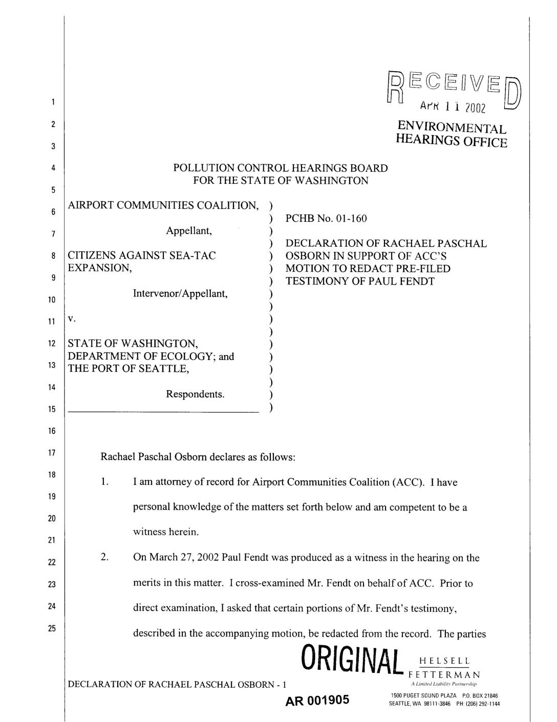 1. I am attorney of record for Airport Communities Coalition (ACC). I have personal knowledge of the matters set forth below and am competent to be a witness herein. 2. On March 27, 2002 Paul Fendt was produced as a witness in the hearing on the z3 merits in this matter. I cross-examined Mr. Fendt on behalfofACC. Prior to direct examination, I asked that certain portions of Mr. Fendt's testimony, described in the accompanying motion, be redacted from the record. The parties ORIGINALH L'ELFETTERMAN DECLARATION OF RACHAEL PASCHAL OSBORN - 1 ALimitedLiabilitvP............ hip AR 001905 _ooP._,sou.°_z__o.ox_,_,,SEATTLE,WA 98111-3846 PH:(206)292-1144 were directed to confer with each other and with Administrative Law Judge Eric Lucas. 3. On March 29. 2002, I reminded Mr. Gil Reavis, counsel for the Port of Seattle, that we needed to resolve the issue of redaction of Mr. Fendt's testimony. I indicated to him the sentence and exhibit ACC proposed for redaction. Hc stated he would talk with Mr. Fendt and Set back to me. 4. On April 3, 2002, I scat an e-mail to Mr. Reavis asking again that he inform me of the Port's position concerning the proposed redaction.10 5. I received no response until April 8, 2002, when I was contacted by Mr. Stephen Tan of Mr, Reavis' office. Mr, Tan indicated that Mr, Reavis had left on var_tion and that the Port believed the material proposed for redaction to fall outside the scope of the Board's order redacting materi_ not produced prior to Fcbrua_ry28, 2002.… -