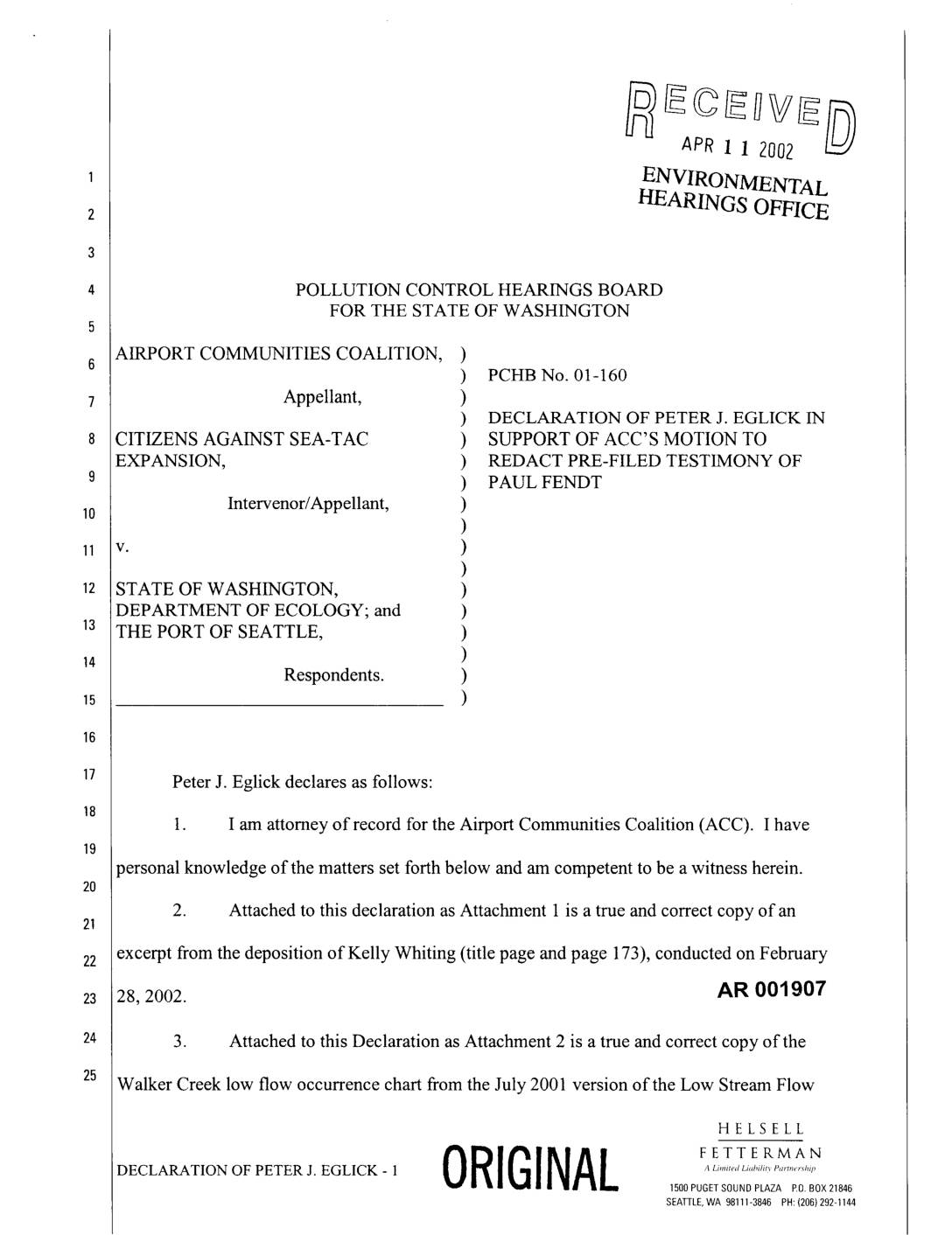 1. I am attorney of record for the Airport Communities Coalition (ACC). I have personal knowledge of the matters set forth below and am competent to be a witness herein. 2. Attached to this declaration as Attachment 1 is a true and correct copy of an excerpt from the deposition of Kelly Whiting (title page and page 173), conducted on February 28,2002. AR 001907 3. Attached to this Declaration as Attachment 2 is a true and correct copy of the Walker Creek low flow occurrence chart from the July 2001 version of the Low Stream Flow HELSELL ORIGINALFETTERMANDECLARATION OF PETER J. EGLICK - 1 nLimitedLiabili,,Partner,hip1500PUGETSOUNDPLAZA P.O.BOX21846 SEATTLE,WA 98111-3846 PH:(206)292-1144 Analysis and Flow Impact Offset Facility Plan prepared for the Port of Seattle by Parametrix, Inc. 4. Attached to this Declaration as Attachment 3 is a true and correct copy of the Walker Creek low flow occurrence chart from the December 2001 version of the Low Stream Flow Analysis and Flow Impact Offset Facility Plan prepared for the Port of Seattle by6 Parametrix, Inc. 5. Attached to this Declaration as Attachment 4 is a true and correct copy of the March 2002 Walker Creek low flow occurrence chart submitted as the third page of Exhibit C to the Pre-Filed Direct Testimony of Paul S. Fendt, P.E. (3/7/02). declare under penalty of perjury under the laws of the State of Washington that the foregoing is true and correct. DATED this 11thday of April, 2002, at Seattle, Washington.14 Peter J. Egli'c_ g:lukaccpchbdecl-eglick-fendt.doc AR… -