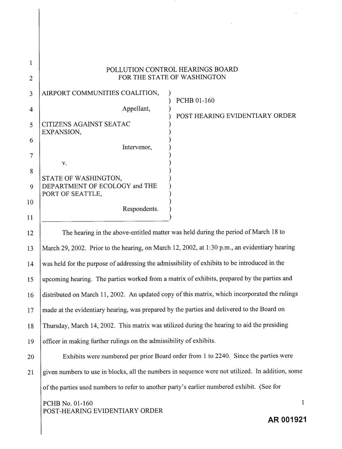 The hearing in the above-entitled matter was held during the period of March 18 to March 29, 2002. Prior to the hearing, on March 12, 2002, at 1:30 p.m., an evidentiary hearing was held for the purpose of addressing the admissibility of exhibits to be introduced in the upcoming hearing. The parties worked from a matrix of exhibits, prepared by the parties and distributed on March 11, 2002. An updated copy of this matrix, which incorporated the rulings made at the evidentiary hearing, was prepared by the parties and delivered to the Board on Thursday, March 14, 2002. This matrix was utilized during the hearing to aid the presiding officer in making further rulings on the admissibility of exhibits. Exhibits were numbered per prior Board order from 1 to 2240. Since the parties were given numbers to use in blocks, all the numbers in sequence were not utilized. In addition, some of the parties used numbers to refer to another party's earlier numbered exhibit. (See for PCHB No. 01-160 1 POST-HEARING EVIDENTIARY ORDER AR 001921 example Exhibit No. 2136.) The parties agreed that when multiple numbers described the same exhibit one number would be used as reference for exhibit labeling and at the hearing. During the hearing on the merits, the admissibility status of many of the exhibits changed. The purpose of this order is to amend the matrix to reflect the evidentiary rulings of the presiding officer at hearing. The updated matrix is attached to this order. At the… -