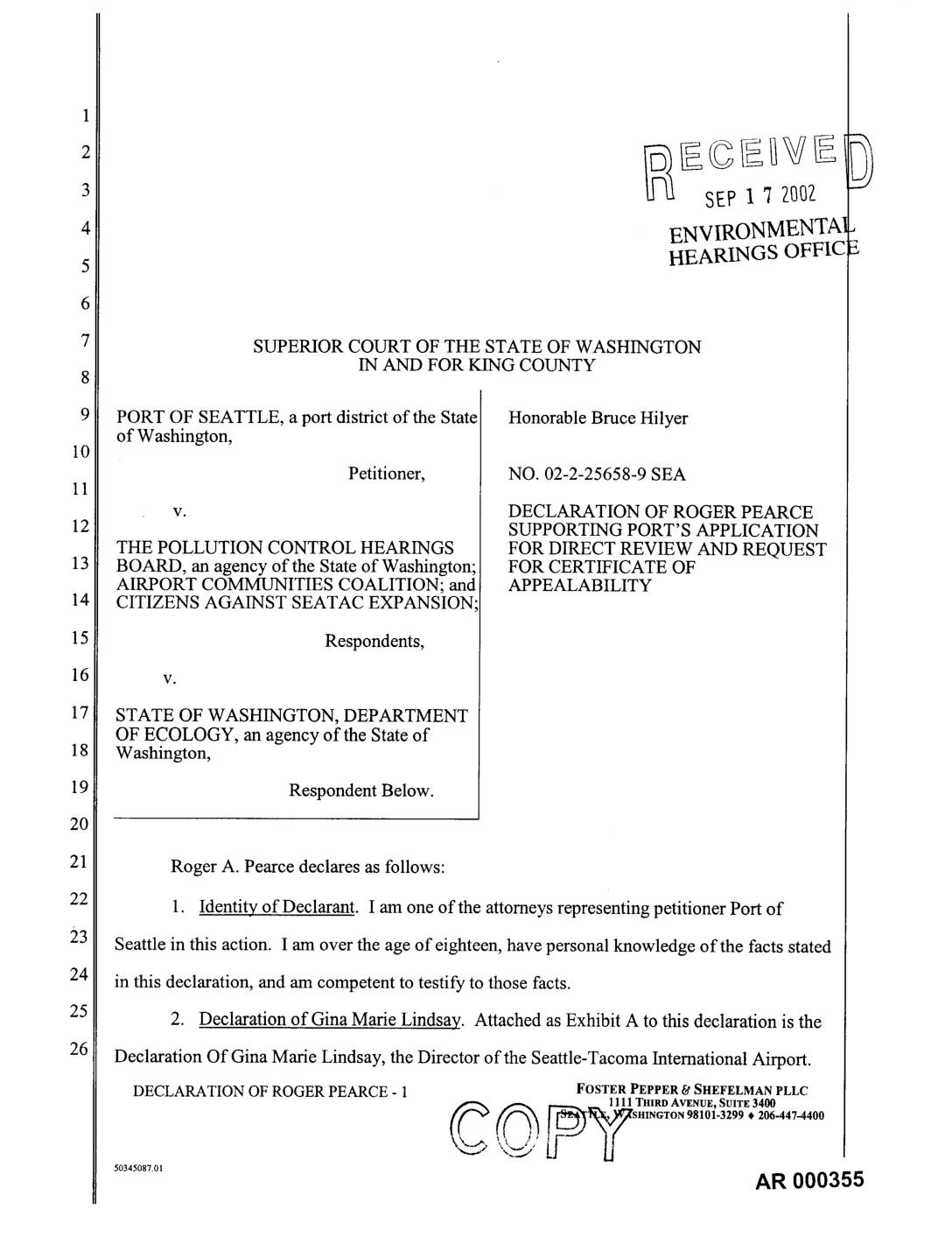 PORT OF SEATTLE, a port district of the State Honorable Bruce Hilyer of Washington, Petitioner, NO. 02-2-25658-9 SEA v. DECLARATION OF ROGER PEARCE SUPPORTING PORT'S APPLICATION THE POLLUTION CONTROL HEARINGS FOR DIRECT REVIEW AND REQUEST BOARD, an agency of the State of Washington; FOR CERTIFICATE OF AIRPORT COMML_ITIES COALITION; and APPEALABILITY CITIZENS AGAINST SEATAC EXPANSION Respondents,