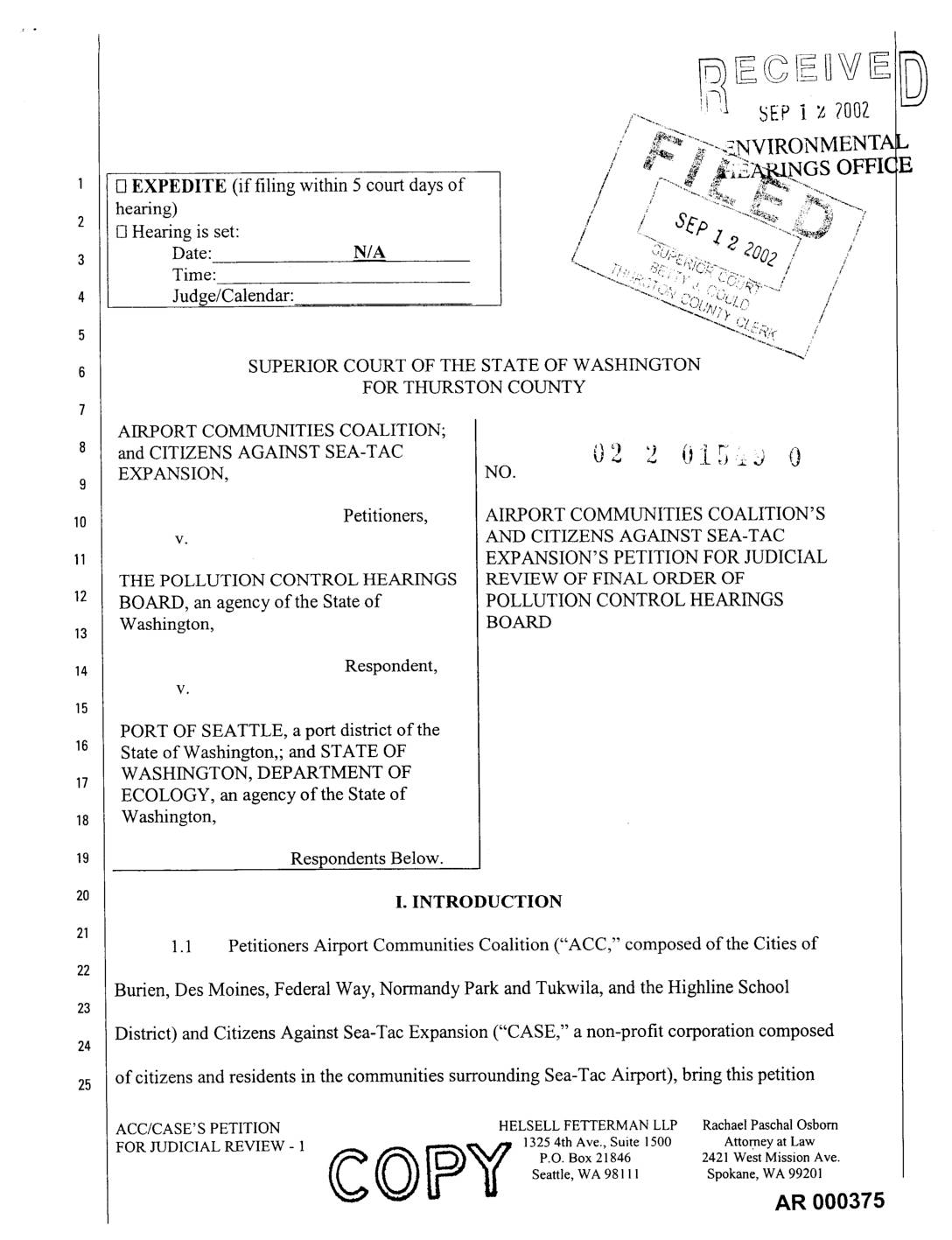 [] EXPEDITE (if filing within 5 court days of / '........_ '_- -._C"-. hearing) / ' "':'_ :_ "':_ _'_'_: ! / S& -. _, .._ ;2 []Hearing is set: ,- ---.'!_." ,/ -.. )'o ._ _ / Date: N/A [ _..,,.'/:.t:,. 408) ' I Time: .,.<,,_:. , j. , , ,._:.,,::,. : ,. Judge/Calendar: "<:"......:-.:t:.:"'0<2,"','"_-"cZ""-.'v."'"--'r_ /; -'<"_'M/,. ...... I "--<,Qr _,/,.... ,-<,,..;.,, [5 "--C;,,,< , SUPERIOR COURT OF THE STATE OF WASHINGTON FOR THURSTON COUNTY AIRPORT COMMUNITIES COALITION; and CITIZENS AGAINST SEA-TAC 0 9,_ '_,., 0_ _ .__)'[ (,) EXPANSION, NO. l0 Petitioners, AIRPORT COMMUNITIES COALITION'S v. AND CITIZENS AGAINST SEA-TAC EXPANSION' S PETITION FOR JUDICIAL THE POLLUTION CONTROL HEARINGS REVIEW OF FINAL ORDER OF _2 BOARD, an agency of the State of POLLUTION CONTROL HEARINGS -