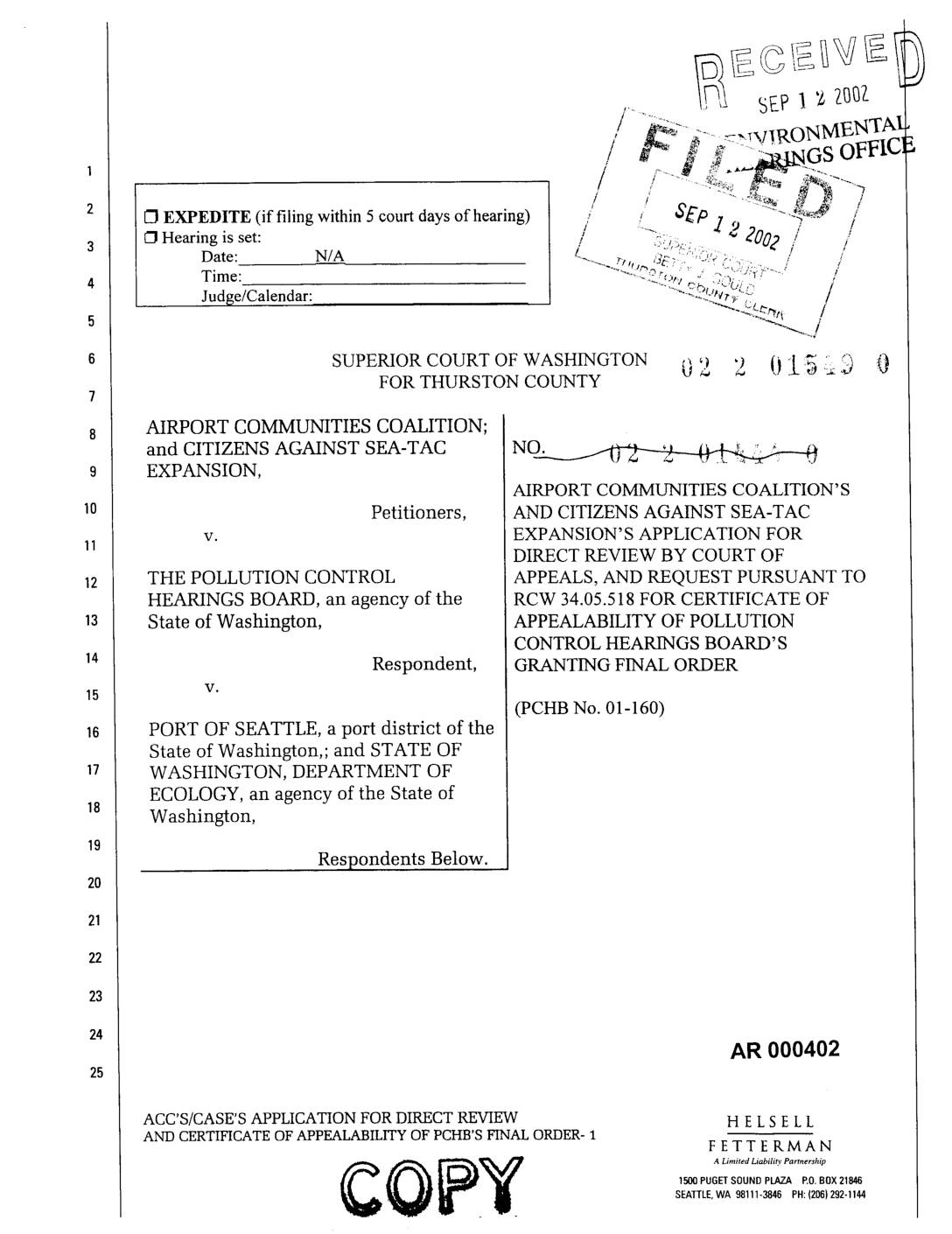 _ EXPEDITE (if filing within 5 court days of hearing) / / _P 1 9 , / _ Hearing is set: / ......_-_;:;..... _ "_200_ / / Date: N/A '--..... :,_,,. ,3_-. '.-.< ,.:-_.:. _ j Time: .....-,-,:),, ° ".-,,: -_ " i Judge/Calendar: "":::E!ffCr,_:'_:: / ''z:L?_,_ / -...../ SUPERIOR COURT OF WASHINGTON 0 'tz, ')_, 0 J__ ,="2_ 0 FOR THURSTON COUNTY AIRPORT COMMUNITIES COALITION; and CITIZENS AGAINST SEA-TAG NO. J x, _ , .,_-_ :_ ;: , EXPANSION, AIRPORT COMMUNITIES COALITION'S Petitioners, AND CITIZENS AGAINST SEA-TAG v. EXPANSION'S APPLICATION FOR DIRECT REVIEW BY COURT OF THE POLLUTION CONTROL APPEALS, AND REQUEST PURSUANT TO HEARINGS BOARD, an agency of the RCW 34.05.518 FOR CERTIFICATE OF -