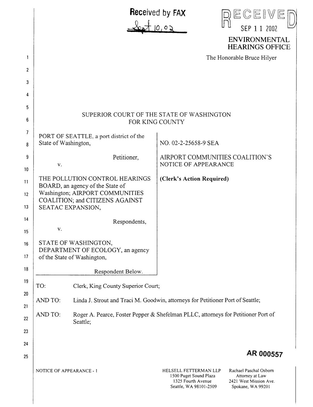 PORT OF SEATTLE, a port district of the State of Washington, NO. 02-2-25658-9 SEA Petitioner, AIRPORT COMMUNITIES COALITION'S v. NOTICE OF APPEARANCE THE POLLUTION CONTROL HEARINGS (Clerk's Action Required)11 BOARD, an agency of the State of Washington; AIRPORT COMMUNITIES COALITION; and CITIZENS AGAINST SEATAC EXPANSION, Respondents, V.15 STATE OF WASHINGTON, DEPARTMENT OF ECOLOGY, an agency of the State of Washington, Respondent Below. TO: Clerk, King County Superior Court; AND TO: Linda J. Strout and Traci M. Goodwin, attorneys for Petitioner Port of Seattle; AND TO: Roger A. Pearce, Foster Pepper & Shefelman PLLC, attorneys for Petitioner Port of Seattle; AR 000557 -