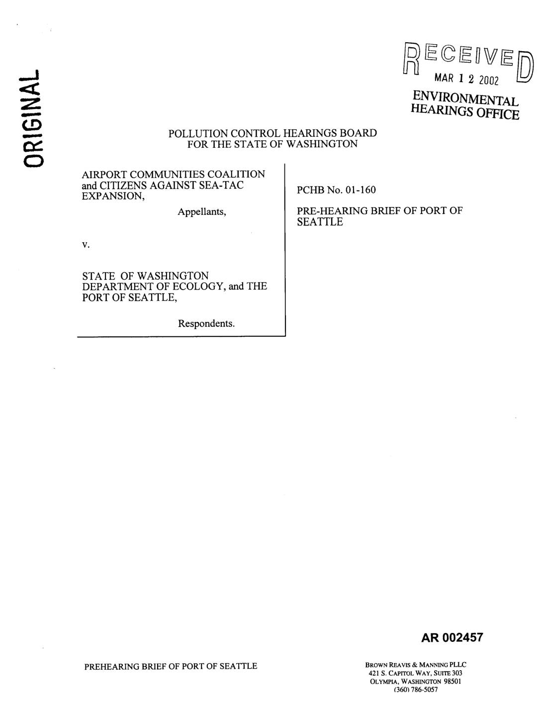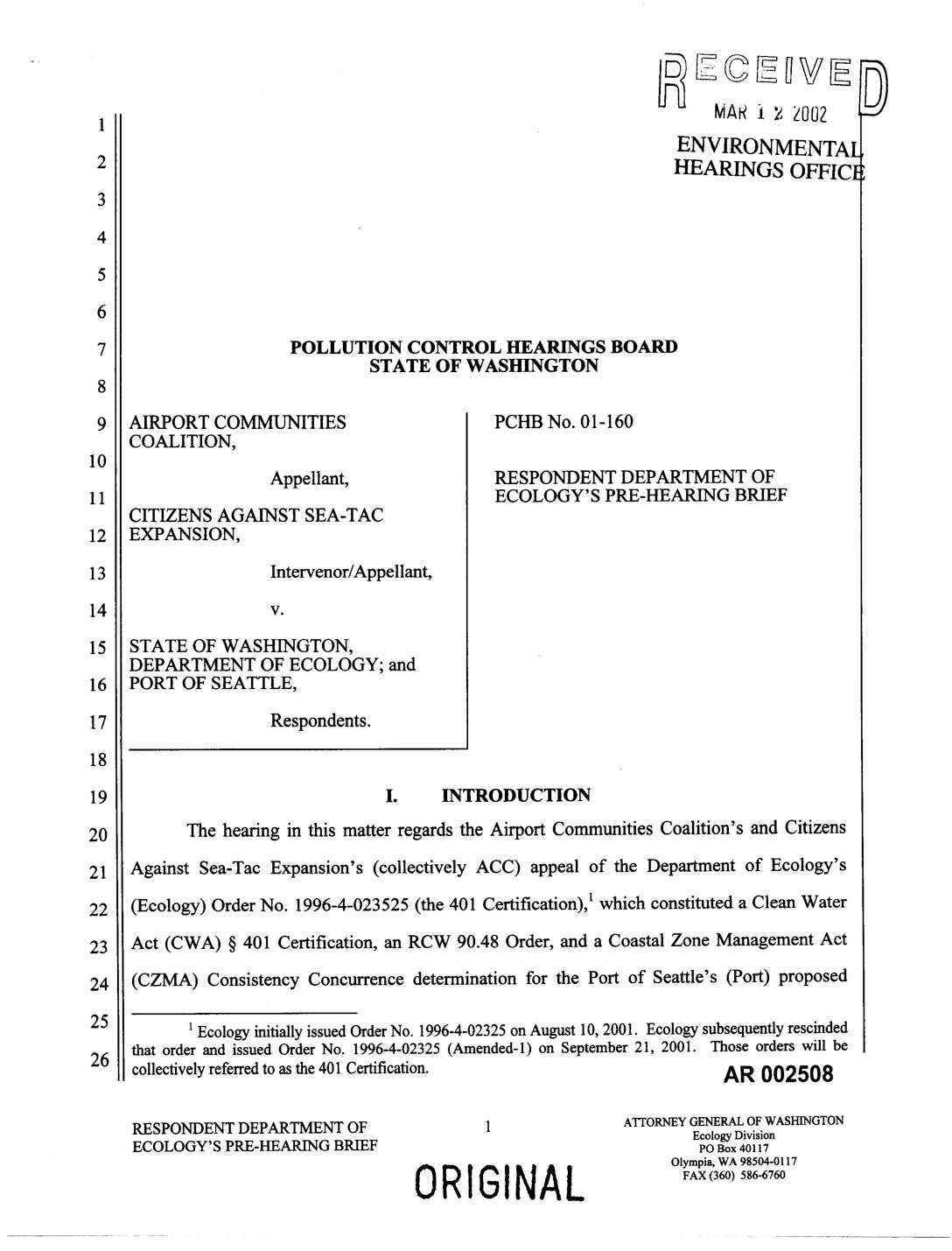 The hearing in this matter regards the Airport Communities Coalition's and Citizens Against Sea-Tat Expansion's (collectively ACC) appeal of the Department of Ecology's (Ecology) Order No. 1996-4-023525 (the 401 Certification), l which constituted a Clean Water Act (CWA) § 401 Certification, an RCW 90.48 Order, and a Coastal Zone Management Act (CZMA) Consistency Concurrence determination for the Port of Seattle's (Port) proposed Ecology initially issued Order No. 1996-4-02325 on August 10, 2001. Ecology subsequently rescinded that order and issued Order No. 1996-4-02325 (Amended-I) on September 21, 2001. Those orders will be collectively referred to as the 401 Certification. AR 002508 RESPONDENT DEPARTMENT OF 1 ATTORNEYGENERALOFWASHINGTON Ecology Division ECOLOGY'S PRE-HEARING BRIEF po Box40117 Olympia, WA 98504-0117 ORIGINAL FAX(360)586-6760 Master Plan Update (MPU) Improvements for the Seattle-Tacoma International Airport (STIA). The evidence and testimony presented to the Pollution Control Hearings Board (Board) will demonstrate that Ecology appropriately issued the 401 Certification. In addition, the hearing will show that the ACC has failed to meet its burden of proof and hence the Board should affirm Ecology's decision. H. BACKGROUND Through testimony and exhibits Ecology expects to prove the following at hearing: The terms of the 401 Certification were developed through extensive coordination with Ecology's experts on wetlands science, hydrology, stormwater management, water quality, and toxics. The Port identified a number of projects in its MPU in order to allow it to efficiently meet existing and future regional air travel demands. In its Joint Aquatic Resources Permit Application (JARPA) the Port states: The airfield… -