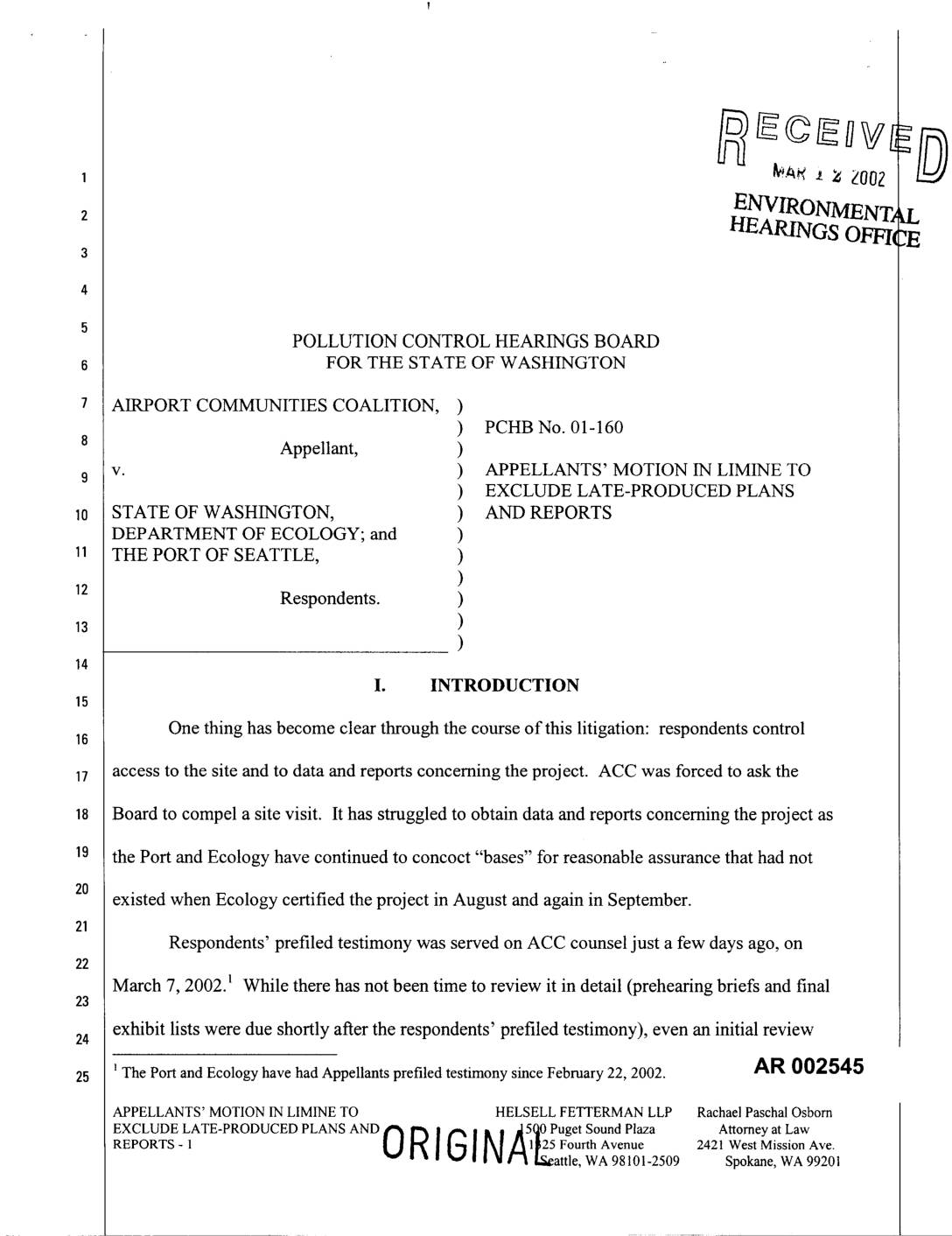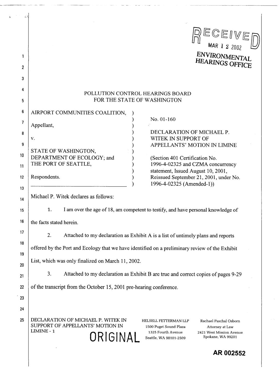 THE PORT OF SEATTLE, ) 1996-4-02325 and CZMA concurrency ) statement, Issued August 10, 2001, Respondents. ) Reissued September 21, 2001, under No. ) 1996-4-02325 (Amended-l)) Michael P. Witek declares as follows:14 1. I am over the age of 18, am competent to testify, and have personal knowledge of the facts stated herein. 2. Attached to my declaration as Exhibit A is a list of untimely plans and reports offered by the Port and Ecology that we have identified on a preliminary review of the Exhibit List, which was only finalized on March 11, 2002. 3. Attached to my declaration as Exhibit B are true and correct copies of pages 9-29 of the transcript from the October 15, 2001 pre-hearing conference. DECLARATION OF MICHAEL P. WITEK IN HELSELL FETTERMAN LLP RachaelPaschalOsborn SUPPORT OF APPELLANTS' MOTION IN 15ooPugetSound Plaza Attorneyat Law LIMINE - 1 1325 Fourth Avenue 2421 West Mission Avenue ORIGINAL Seattle, WA 98101-2509 Spokane, WA 99201 AR 002552 4. Attached to my declaration as Exhibit C is an email from Port Counsel to ACC counsel, sent at 6:02 p.m. on February 15, 2002, and a copy of the attached report: "Third Runway and Embankment Fill Water Quality and Transport Analysis." 5. Attached to my declaration as Exhibit D are true and correct copies of transcript pages 19 and 20 from the February 12, 2002, deposition of Michael Riley. 6. Attached to my declaration as Exhibit E is a true and correct copy of a January 21,7 a 2002 "Technical… -
