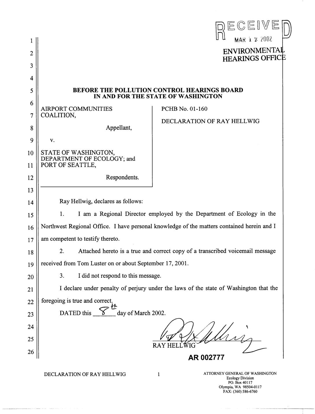Northwest Regional Office. I have personal knowledge of the matters contained herein and I am competent to testify thereto. 2. Attached hereto is a true and correct copy of a transcribed voicemail message received from Tom Luster on or about September 17, 2001. 3. I did not respond to this message. declare under penalty of perjury under the laws of the state of Washington that the foregoing is true and correct. DATED this _ "_day of March 2002. ___'/j4_._ '25 RAY HELI_'IG _J v v_ ___ AR 002777 DECLARATION OF RAY HELLWIG 1 ATTORNEYGENERALOFWASHINGTON Ecology Division PO. Box 40117 Olympia, WA 98504-0117 FAX: (360) 586-6760 03/08/02 15:25 F&X 425 649 7098 DEPT OF ECOLOGY _003 MAR 1 1 .002_ ENVIRONM SNTAL HEARINGS )FFICE BEFORE Tl:Oe_POLLUTION CONTROL HEARINGS BOARD IN AND FOR _ STATE OF WASWINGTON AIRPORT COMMUNITIES PCI-IBNo. 01-160 COALITION, DECLARATION OF RAY HELLWlG Appellant, v. -