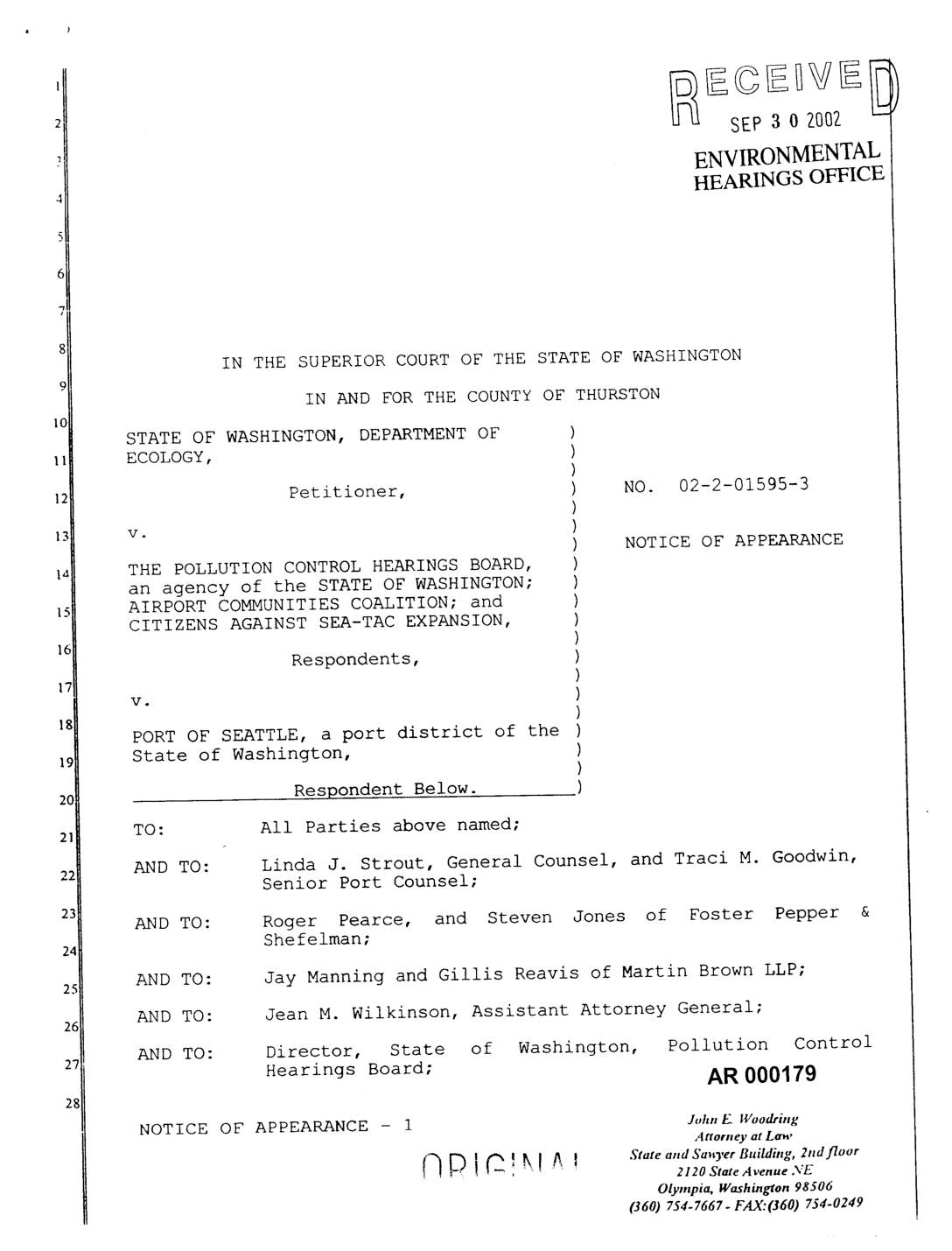 an agency of the STATE OF WASHINGTON; ) AIRPORT COMMUNITIES COALITION; and ) CITIZENS AGAINST SEA-TAC EXPANSION, ) l ) Respondents, ) l ) v. ) ) PORT OF SEATTLE, a port district of the ) State of Washington, ) ) Respondent Below. ) TO: All Parties above named; AND TO: Linda J. Strout, General Counsel, and Traci M. Goodwin, Senior Port Counsel; AND TO: Roger Pearce, and Steven Jones of Foster Pepper & Shefelman; AND TO: Jay Manning and Gillis Reavis of Martin Brown LLP;2 AND TO: Jean M. Wilkinson, Assistant Attorney General;2 -