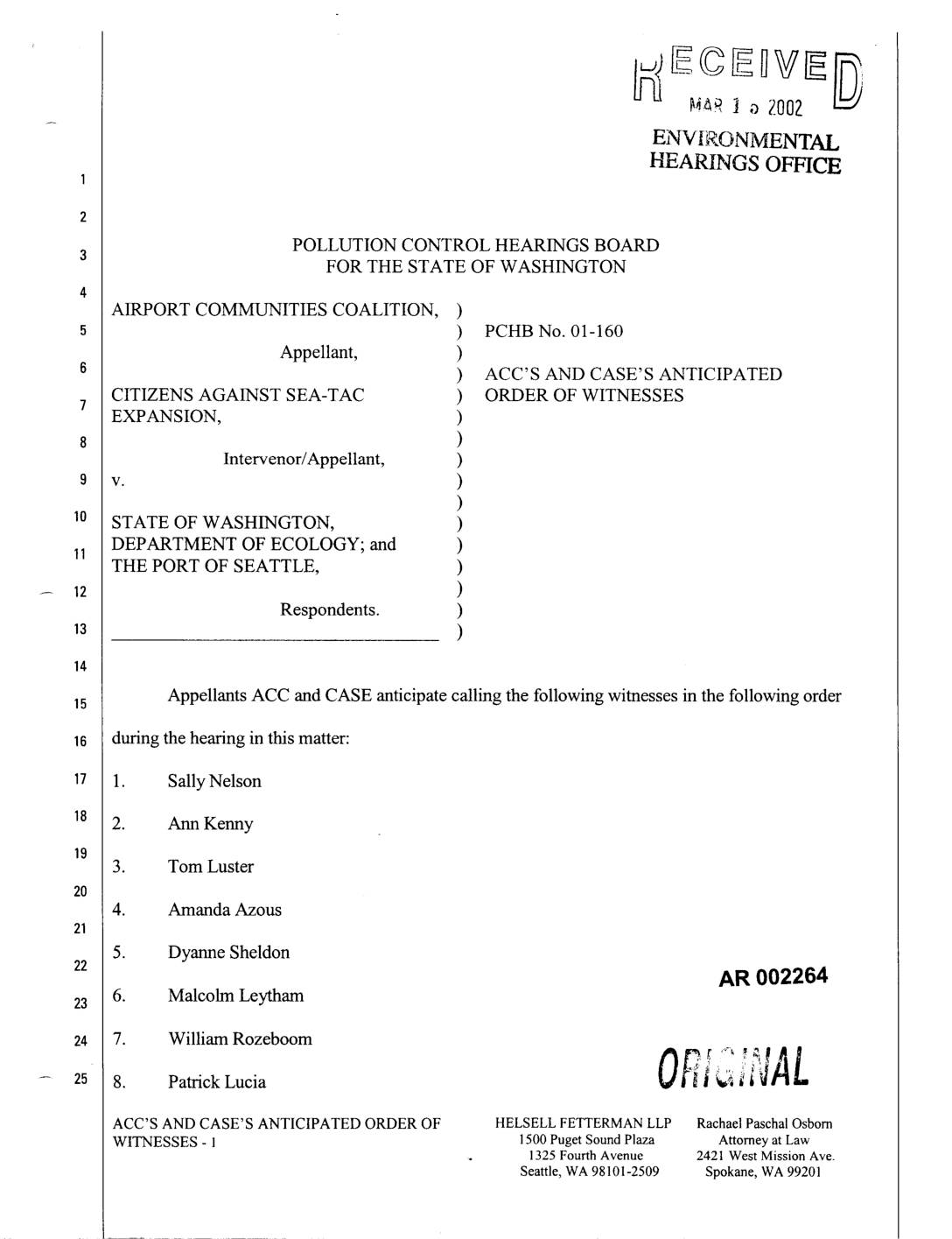 8. Patrick Lucia _ _ i i _/_ L ACC'S AND CASE'S ANTICIPATED ORDER OF HELSELL FETTERMAN LLP Rachael Paschal Osbom WITNESSES - 1 1500 Puget SoundPlaza Attorney at Law o 1325 Fourth Avenue 2421 West Mission Ave. Seattle, WA98101-2509 Spokane, WA99201 9. Greg Wingard 10. Dan Swenson 11. George Schlender 12. Bob Barwin fi 13. Douglas Rushton 14. Edward Kavazanjian7 15. Peter Willing 16. John Strand In addition, ACC reserves the fight to call by live testimony or by deposition Ecology witnesses designated in ACC's Amended Notice to Attend Trial in the event Ecology fails to call such designated wimesses. DATED this _ day of March, 2002. HELSELL FETTERMAN LLP " -g@ By: ter-J. Eglick, _SBA#8809 " "- -'- _'___e.te_nJLEsg_ock,WSBA #14541 ;h810sborn Michael P. Witek, WSBA #26598 Attomey for Appellant ACC Attomeys for Appellant ACC SMITH & LOWNEY By: J_ R/hard A. Poulin, WSBA #27782 V ,Attorneys for Appellant CASE24 AR 002265 g:lu_accpchbwimesses-order.doc ACC'S AND CASE'S ANTICIPATED ORDER OF HELSELL FETTERMAN LLP Rachael Paschal Osbom WITNESSES - 2 1500 Puget Sound Plaza Attorney at Law 1325 Fourth Avenue 2421 West Mission Ave. Seattle, WA 98101-2509 Spokane, WA 99201 ENVIRONMENTAL a HEARINGSOFFICE POLLUTION CONTROL HEARINGS BOARD FOR THE STATE OF WASHINGTON AIRPORT COMMUNITIES COALITION ) And CITIZENS AGAINST SEA-TAC ) No. 01-160 EXPANSION, ) ) CERTIFICATE OF SERVICE Appellant, )