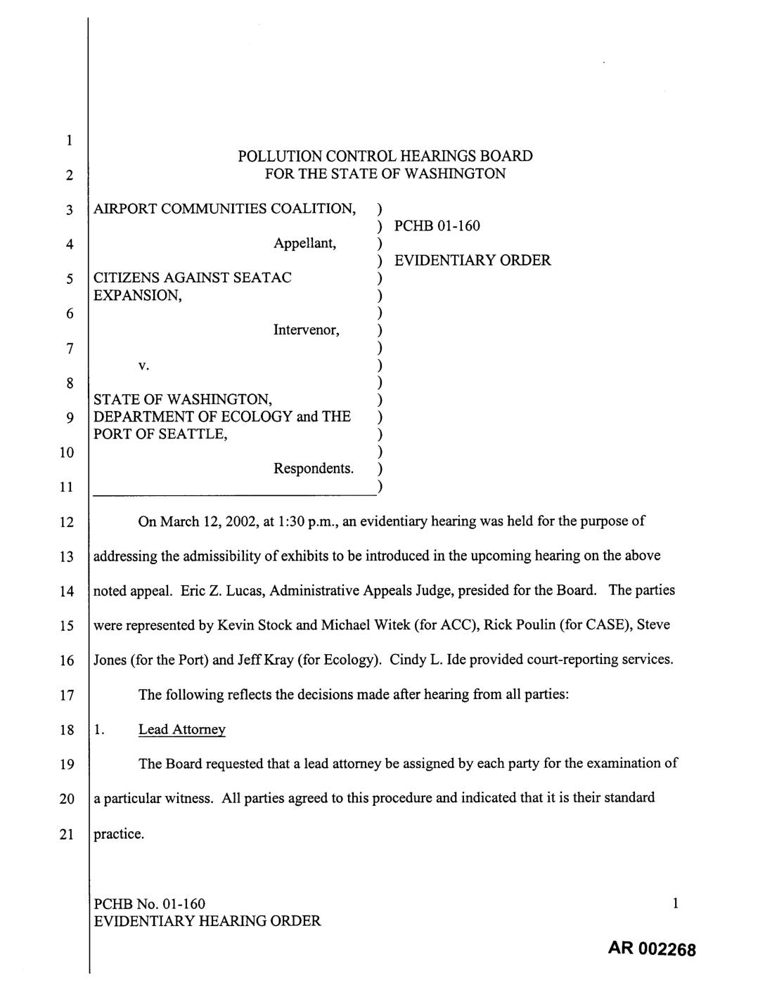 On March 12, 2002, at 1:30 p.m., an evidentiary hearing was held for the purpose of addressing the admissibility of exhibits to be introduced in the upcoming hearing on the above noted appeal. Eric Z. Lucas, Administrative Appeals Judge, presided for the Board. The parties were represented by Kevin Stock and Michael Witek (for ACC), Rick Poulin (for CASE), Steve Jones (for the Port) and Jeff Kray (for Ecology). Cindy L. Ide provided court-reporting services. The following reflects the decisions made after hearing from all parties: 1. Lead Attorney The Board requested that a lead attorney be assigned by each party for the examination of a particular witness. All parties agreed to this procedure and indicated that it is their standard practice. PCHB No. 01-160 1 EVIDENTIARY HEARING ORDER AR 002268 2. Order of Witnesses The Board requested that appellants indicate, in advance of the March 14, 2002 submission, their witness order for the first two days of the heating. Appellants agreed to email this information to the Board the morning of March 13, 2002. 3. Exchange of Exhibits The presiding officer inquired whether all exhibits had been exchanged that were objected to for failure to be included on the February 20, 2002 exhibit list. Generally, the response was affirmative that the exhibits subject to that specific objection had been exchanged. However, a complaint was lodged concerning other documents that were not disclosed by the deadline. 4. Motion in Limine The presiding officer inquired whether the parties contemplated filing any… -