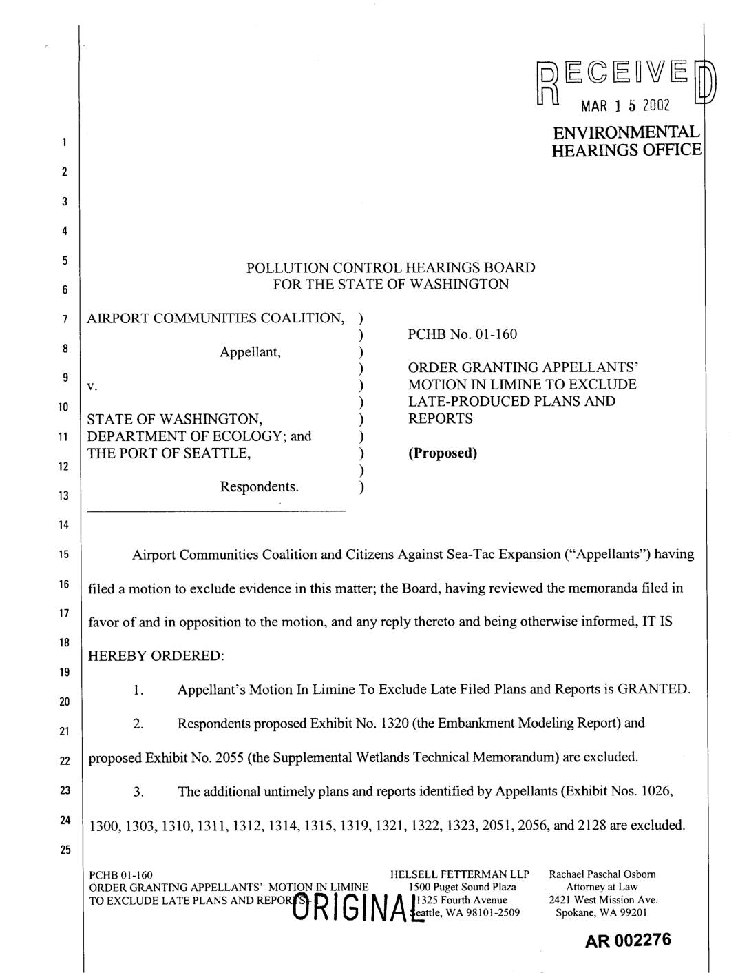 v. ) MOTION IN LIMINE TO EXCLUDE ) LATE-PRODUCED PLANS AND STATE OF WASHINGTON, ) REPORTS DEPARTMENT OF ECOLOGY; and ) THE PORT OF SEATTLE, ) (Proposed) ) Respondents. ) Airport Communities Coalition and Citizens Against Sea-Tac Expansion ("Appellants") having filed a motion to exclude evidence in this matter; the Board, having reviewed the memoranda filed in favor of and in opposition to the motion, and any reply thereto and being otherwise informed, IT IS HEREBY ORDERED: 1. Appellant's Motion In Limine To Exclude Late Filed Plans and Reports is GRANTED. 2. Respondents proposed Exhibit No. 1320 (the Embankment Modeling Report) and21 proposed Exhibit No. 2055 (the Supplemental Wetlands Technical Memorandum) are excluded. 3. The additional untimely plans and reports identified by Appellants (Exhibit Nos. 1026, 1300, 1303, 1310, 1311, 1312, 1314, 1315, 1319, 1321, 1322, 1323, 2051, 2056, and 2128 are excluded. PCHB 01-160 HELSELL FETTERMAN LLP Rachael Paschal Osborn ORDER GRANTING APPELLANTS' MOTION IN LIMINE 1500Puget Sound Plaza Attorney at Law _._ttle, WA 98101-2509 Spokane,WA 99201 AR 002276 4. Respondents may not rely on any of the excluded exhibits, or testify regarding them at the1 heating. 5. Portions ofpre-filed testimony relying upon these exhibits are striken. 6. Within seven days of entry of this Order, Appellants will indicate to the Board the portions ofpre-filed testimony that should be stricken. SO ORDERED this day of ., 2002. POLLUTION CONTROL HEARINGS BOARD KALEEN COTTINGHAM, Presiding ROBERT V. JENSEN, Member WILLIAM LYNCH, Member Presented by: HELSELLFETTE A P Peter J. Eglick,… -