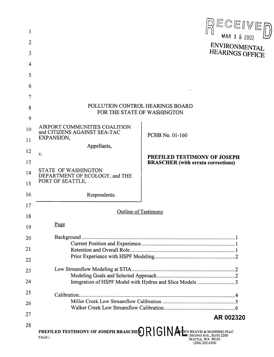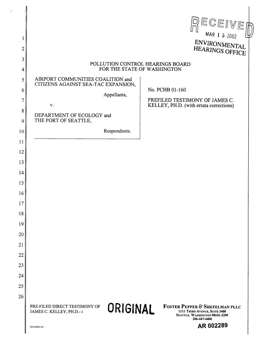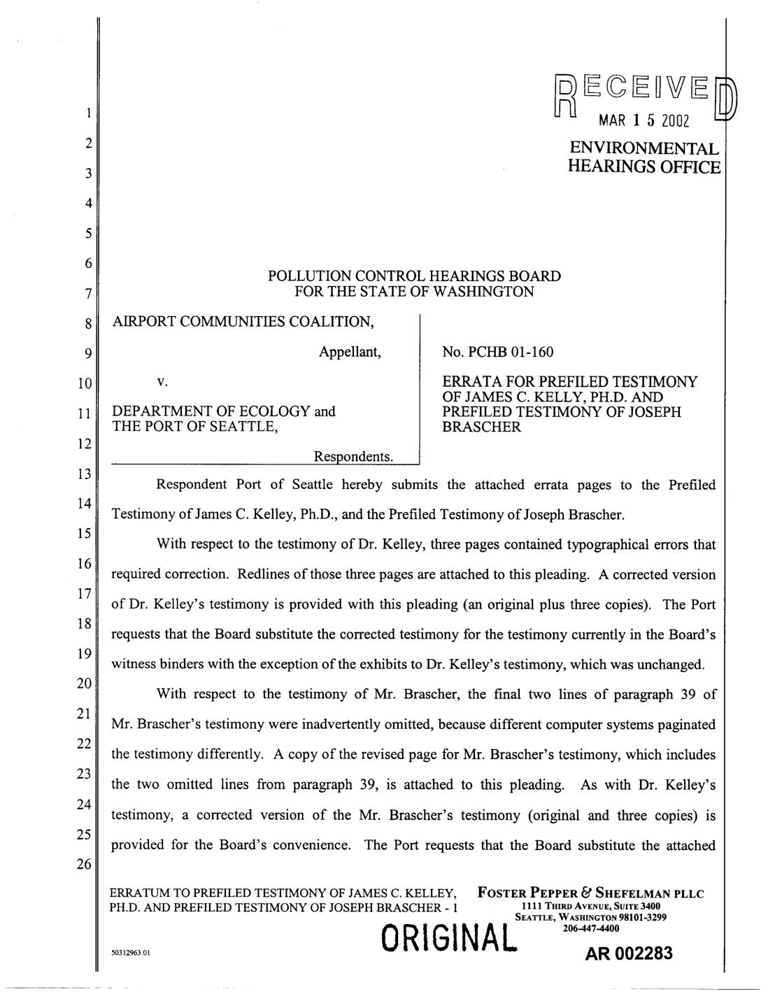 Respondent Port of Seattle hereby submits the attached errata pages to the Prefiled Testimony of James C. Kelley, Ph.D., and the Prefiled Testimony of Joseph Brascher. With respect to the testimony of Dr. Kelley, three pages contained typographical errors that required correction. Redlines of those three pages are attached to this pleading. A corrected version of Dr. Kelley's testimony is provided with this pleading (an original plus three copies). The Port requests that the Board substitute the corrected testimony for the testimony currently in the Board's witness binders with the exception of the exhibits to Dr. Kelley's testimony, which was unchanged. With respect to the testimony of Mr. Brascher, the final two lines of paragraph 39 of Mr. Brascher's testimony were inadvertently omitted, because different computer systems paginated the testimony differently. A copy of the revised page for Mr. Brascher's testimony, which includes the two omitted lines from paragraph 39, is attached to this pleading. As with Dr. Kelley's testimony, a corrected version of the Mr. Brascher's testimony (original and three copies) is provided for the Board's convenience. The Port requests that the Board substitute the attached ERRATUM TO PREFILED TESTIMONY OF JAMES C. KELLEY, FOSTER PEPPER _' SHEFELMAN PLLC PH.D. AND PREFILED TESTIMONY OF JOSEPH BRASCHER - 1 1111Tram)AVENUE, SUITE3400 SEATTLE, WASHINGTON 98101-3299 50312963.01 ORIGINAL ,o.4,ooAR 002283 corrected testimony for the prefiled testimony in the Board's witness books, with the exception of the exhibits to Mr. Brascher's testimony, which are unchanged. Respectfully submitted this 14thday of March, 2002. PORT… -