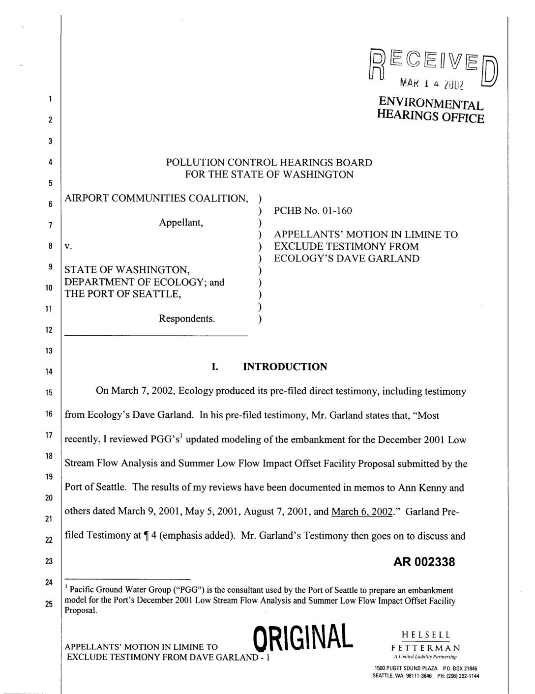On March 7, 2002, Ecology produced its pre-filed direct testimony, including testimony from Ecology's Dave Garland. In his pre-filed testimony, Mr. Garland states that, "Most recently, I reviewed PGG's 1updated modeling of the embankment for the December 2001 Low Stream Flow Analysis and Summer Low Flow Impact Offset Facility Proposal submitted by the Port of Seattle. The results of my reviews have been documented in memos to Ann Kenny and others dated March 9, 2001, May 5, 2001, August 7, 2001, and March 6, 2002." Garland Pre-21 filed Testimony at ¶ 4 (emphasis added). Mr. Garland's Testimony then goes on to discuss and AR 002338 ' Pacific Ground Water Group ("PGG") is the consultant used by the Port of Seattle to prepare an embankment model for the Port's December 2001 Low Stream Flow Analysis and Summer Low Flow Impact Offset Facility Proposal. ORIGINALHELSELLAPPELLANTS'MOTION IN LIMINE TO F ET T E R M A N EXCLUDE TESTIMONY FROM DAVE GARLAND - 1 ALimitedLiability Partnership 1500PUGETSOUNDPLAZA P.0.BOX21846 SEATTLE,WA 98111-3846 PH:(206)292-1144 express his opinions regarding the Port's new December 2001 Low Flow Analysis, and to reply to criticisms of the plan by ACC's Dr. Lucia. ld. at ¶¶ 11-15; 16-19. This was the first indication ACC had that Mr. Garland reviewed, prepared a report on, and would be testifying concerning the December 2001 Low Flow Analysis, despite repeated, specific inquiries to Ecology as to whether Mr. Garland would give such testimony. Ecology's inexcusable failure to identify or produce Mr. Garland's March 6 Low… -