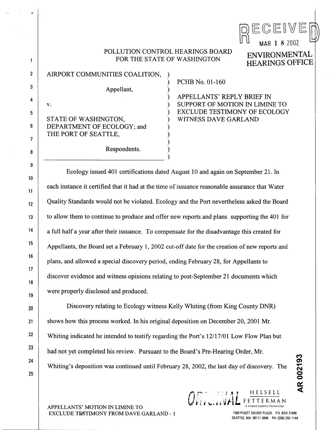 v. ) SUPPORT OF MOTION IN LIMINE TO ) EXCLUDE TESTIMONY OF ECOLOGY STATE OF WASHINGTON, ) WITNESS DAVE GARLAND DEPARTMENT OF ECOLOGY; and ) THE PORT OF SEATTLE, ) ) Respondents. ) ) Ecology issued 401 certifications dated August 10 and again on September 21. In each instance it certified that it had at the time of issuance reasonable assurance that Water Quality Standards would not be violated. Ecology and the Port nevertheless asked the Board to allow them to continue to produce and offer new reports and plans supporting the 401 for a full half a year after their issuance. To compensate for the disadvantage this created for Appellants, the Board set a February 1, 2002 cut-off date for the creation of new reports and plans, and allowed a special discovery period, ending February 28, for Appellants to discover evidence and witness opinions relating to post-September 21 documents which were properly disclosed and produced. Discovery relating to Ecology witness Kelly Whiting (from King County DNR) shows how this process worked. In his original deposition on December 20, 2001 Mr. Whiting indicated he intended to testify regarding the Port's 12/17/01 Low Flow Plan but had not yet completed his review. Pursuant to the Board's Pre-Hearing Order, Mr. O_ Whiting's deposition was continued until February 28, 2002, the last day of discovery. The x-¢N Iz HELSELL O, JiL""_ ' _ FETTERMAN APPELLANTS' MOTION IN LIMINE TO A Limited Liability e ........ hip EXCLUDE TFC3TIMONY FROM DAVE GARLAND - 1 1500PUGETSOUNDPLAZAR0.BOX21848…