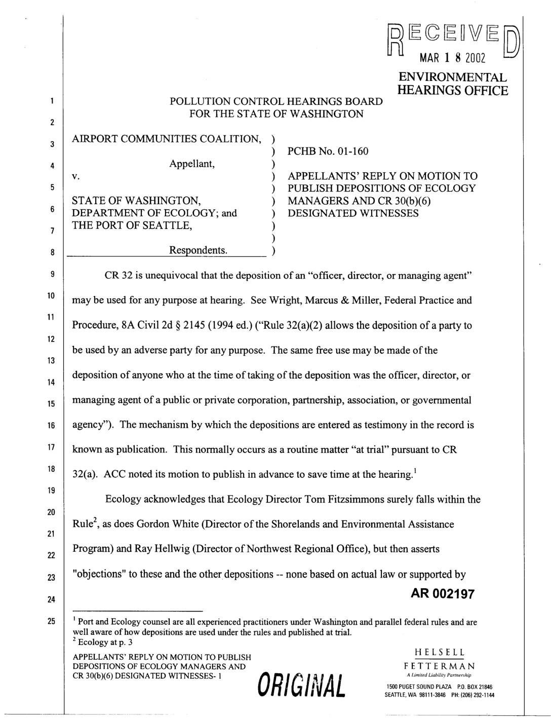v. ) APPELLANTS' REPLY ON MOTION TO ) PUBLISH DEPOSITIONS OF ECOLOGY STATE OF WASHINGTON, ) MANAGERS AND CR 30(b)(6) DEPARTMENT OF ECOLOGY; and ) DESIGNATED WITNESSES THE PORT OF SEATTLE, )7 ) Respondents. ) CR 32 is unequivocal that the deposition of an "officer, director, or managing agent" may be used for any purpose at hearing. See Wright, Marcus & Miller, Federal Practice and Procedure, 8A Civil 2d § 2145 (1994 ed.) ("Rule 32(a)(2) allows the deposition of a party to be used by an adverse party for any purpose. The same free use may be made of the deposition of anyone who at the time of taking of the deposition was the officer, director, or14 managing agent of a public or private corporation, partnership, association, or governmental agency"). The mechanism by which the depositions are entered as testimony in the record is known as publication. This normally occurs as a routine matter "at trial" pursuant to CR 32(a). ACC noted its motion to publish in advance to save time at the hearing. 1 Ecology acknowledges that Ecology Director Tom Fitzsimmons surely falls within the Rule 2, as does Gordon White (Director of the Shorelands and Environmental Assistance Program) and Ray Hellwig (Director of Northwest Regional Office), but then asserts "objections" to these and the other depositions -- none based on actual law or supported by AR 002197 Port and Ecology counsel are all experienced practitioners under Washington and parallel federal rules and are well aware of how depositions… -