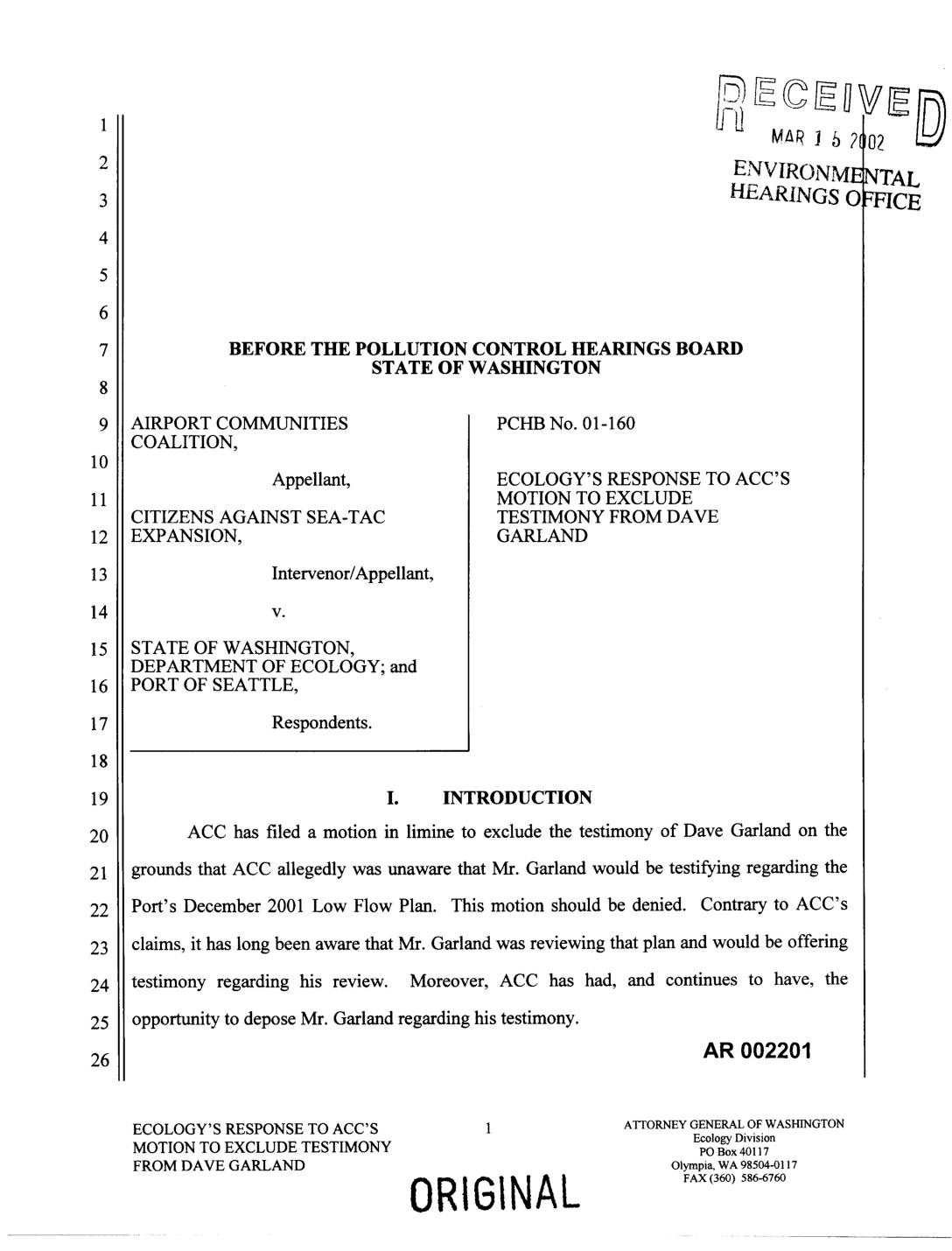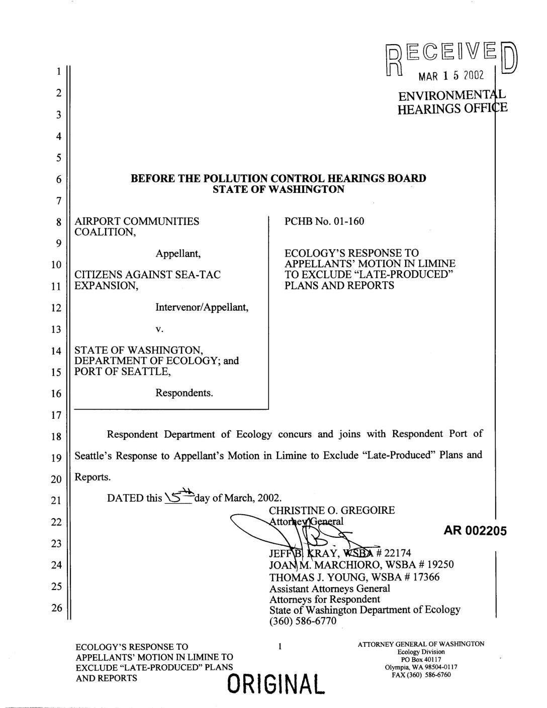 Seattle's Response to Appellant's Motion in Limine to Exclude "Late-Produced" Plans and Reports. DATED this _--x_'_day of March, 2002. CHRISTINE O. GREGOIRE (____.._..._ AR002205 1_lJEF ___k_ Y, 9ES.B_ # 22174 JOAN]M. MARCHIORO, WSBA # 19250 THOMAS J. YOUNG, WSBA # 17366 Assistant Attorneys General Attorneys for Respondent State of Washington Department of Ecology (360) 586-6770 ECOLOGY'S RESPONSE TO 1 ATTORNEYGENERALOFWASHINGTONEcologyDivision APPELLANTS' MOTION IN LIMINE TO vo Box40117 EXCLUDE "LATE-PRODUCED" PLANS Olympia,WA98504-0117 AND REPORTS ORIGINAL FAX(360) 586-6760 PCHB059002205 -