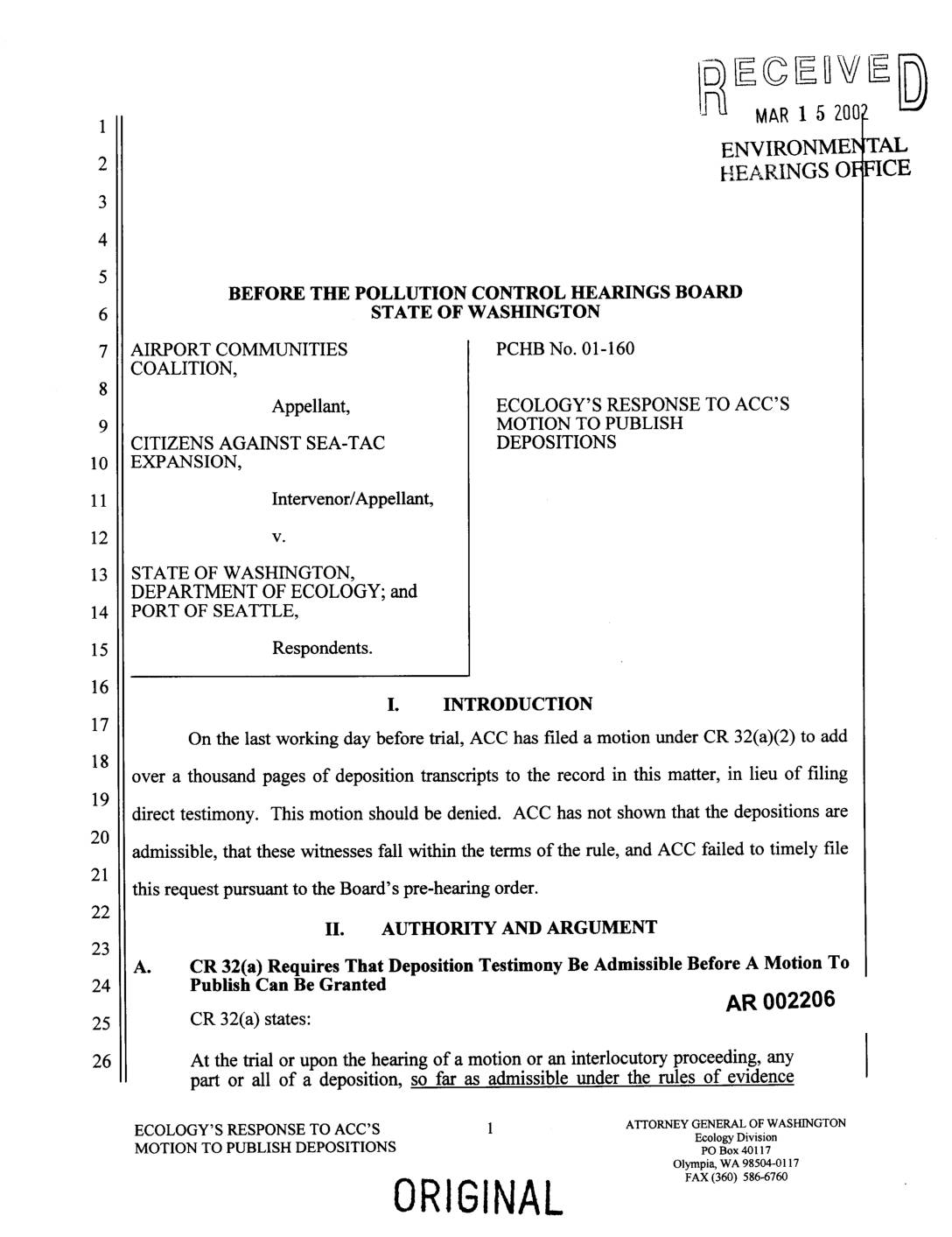 On the last working day before trial, ACC has filed a motion under CR 32(a)(2) to add over a thousand pages of deposition transcripts to the record in this matter, in lieu of filing direct testimony. This motion should be denied. ACC has not shown that the depositions are admissible, that these witnesses fall within the terms of the rule, and ACC failed to timely file this request pursuant to the Board's pre-hearing order. II. AUTHORITY AND ARGUMENT A. CR 32(a) Requires That Deposition Testimony Be Admissible Before A Motion To Publish Can Be Granted AR 002206 CR 32(a) states: At the trial or upon the hearing of a motion or an interlocutory proceeding, any part or all of a deposition, so far as admissible under the rules of evidence ECOLOGY'SRESPONSETOACC'S 1 ATTORNEYGENERALOFWASHINGTON Ecology Division MOTIONTOPUBLISHDEPOSITIONS POBox40117 Olympia, WA 98504-0117 ORIGINAL FAX(360)586-6760 applied as though the witness were then present and testifying, may be used against any party who is present or represented at the taking of the deposition or who had reasonable notice thereof .... " ACC ignores this language in its motion, instead citing CR 32(a)(2). Plainly, however, the introductory language to the rule applies to all the subparts, including subpart two. Under this language, a deposition is admissible only if the testimony is admissible under the rules of evidence. See 8A Charles A. Wright, et al., Federal Practice and Procedure § 2151 (1994). ACC has made no showing that the testimony it seeks to introduce is admissible.… -