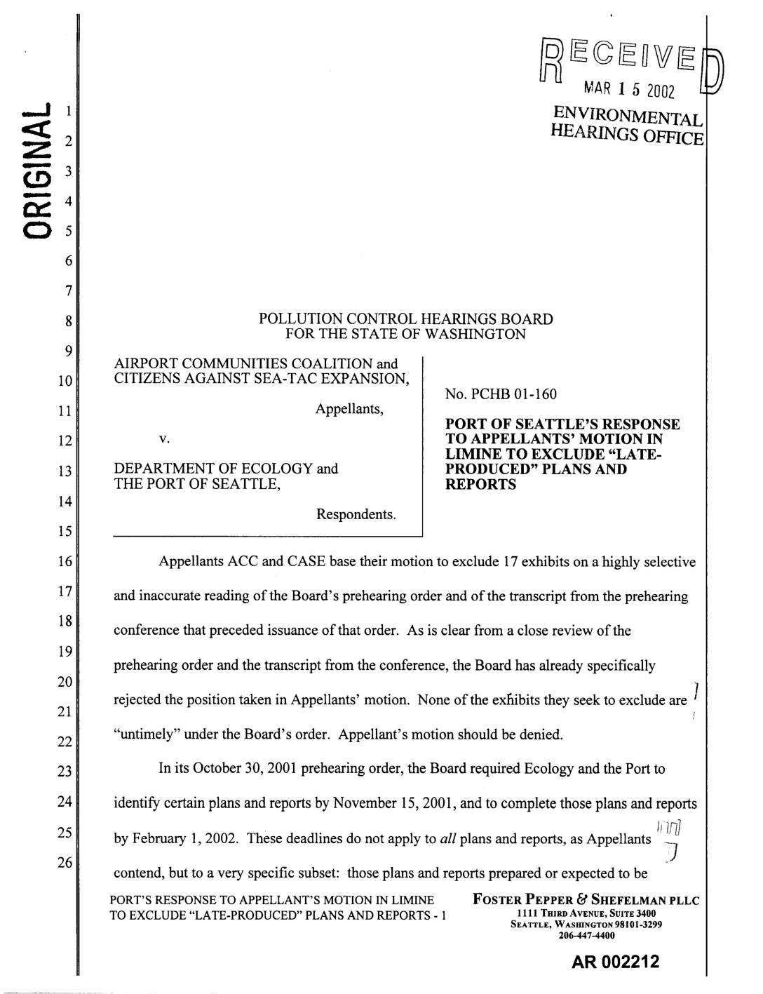 and inaccurate reading of the Board's prehearing order and of the transcript from the preheating conference that preceded issuance of that order. As is clear from a close review of the prehearing order and the transcript from the conference, the Board has already specifically rejected the position taken in Appellants' motion. None of the exfiibits they seek to exclude are ] "untimely" under the Board's order. Appellant's motion should be denied. In its October 30, 2001 prehearing order, the Board required Ecology and the Port to identify certain plans and reports by November 15, 2001, and to complete those plans and reports by February 1, 2002. These deadlines do not apply to all plans and reports, as Appellants _'] contend, but to a very specific subset: those plans and reports prepared or expected to be PORT'S RESPONSE TO APPELLANT'S MOTION IN LIMINE FOSTER PEPPER _d SHEFELMAN PLLC TOEXCLUDE"LATE-PRODUCED"PLANSANDREPORTS- 1 1111 TulsaAVENUE,SUITE3400 SEATTLE, WASHINGTON 98101-3299 206-447-4400 AR 002212 prepared "pursuant to the §401 Certification." None of the 17 documents that Appellants seek to exclude were prepared "pursuant to the §401 Certification," and consequently none should be excluded. In fact, many of the 17 documents that Appellants seek to exclude are neither "plans" nor "reports." Several of them are figures (documents 1-13) or compilations of analytical data (documents 8 and 9). Others include a memorandum containing comments (document 14) and an interlocal agreement between the Portand Ecology (document 17).7 Appellants quote the relevant provision from the Board's preheating order, but they ignore… -